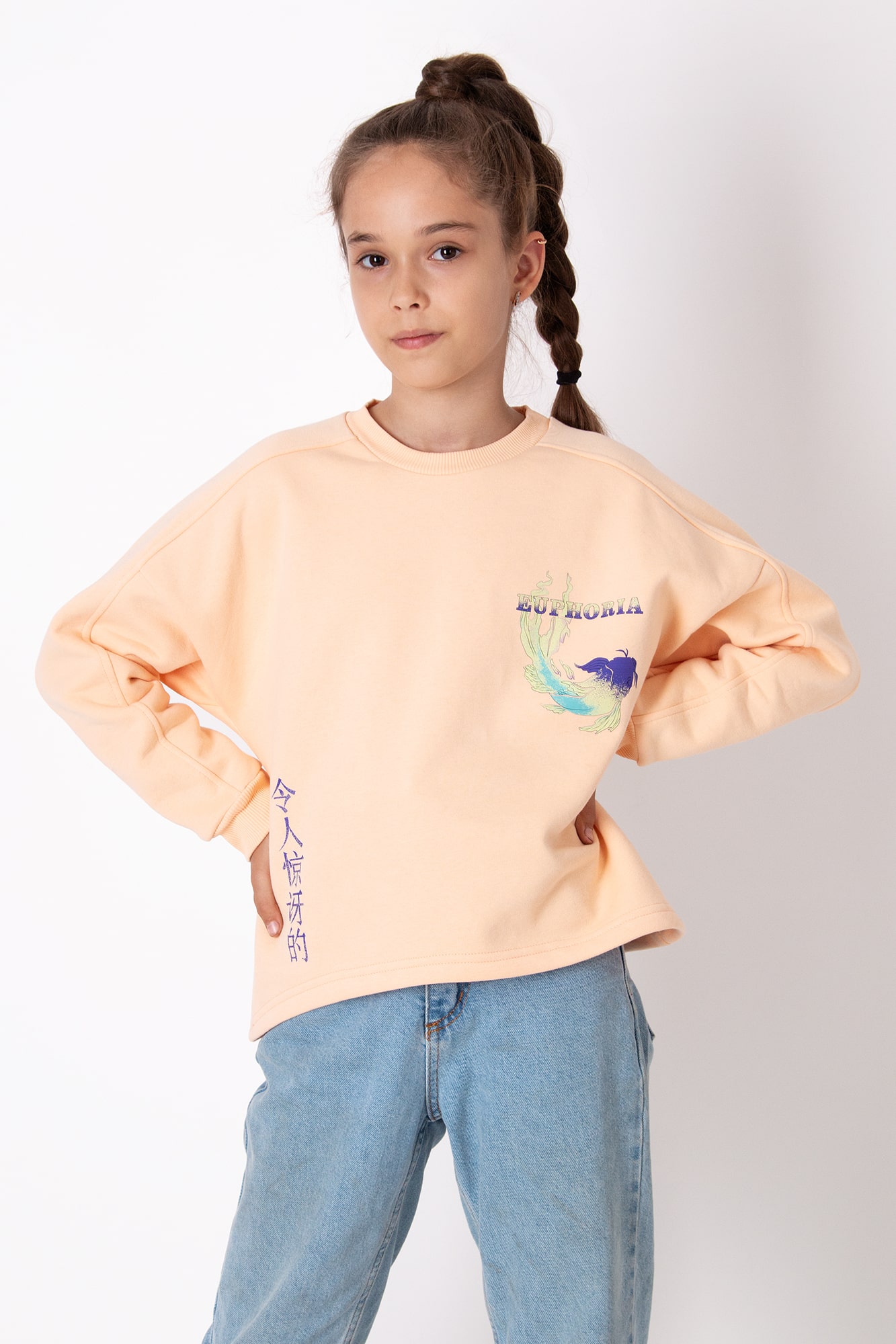 Світшот з м’якого трикотажу на флісі має вільний крій, круглий виріз і спущене плече. Яскравий принт і написи — стильний акцент для щоденних образів.