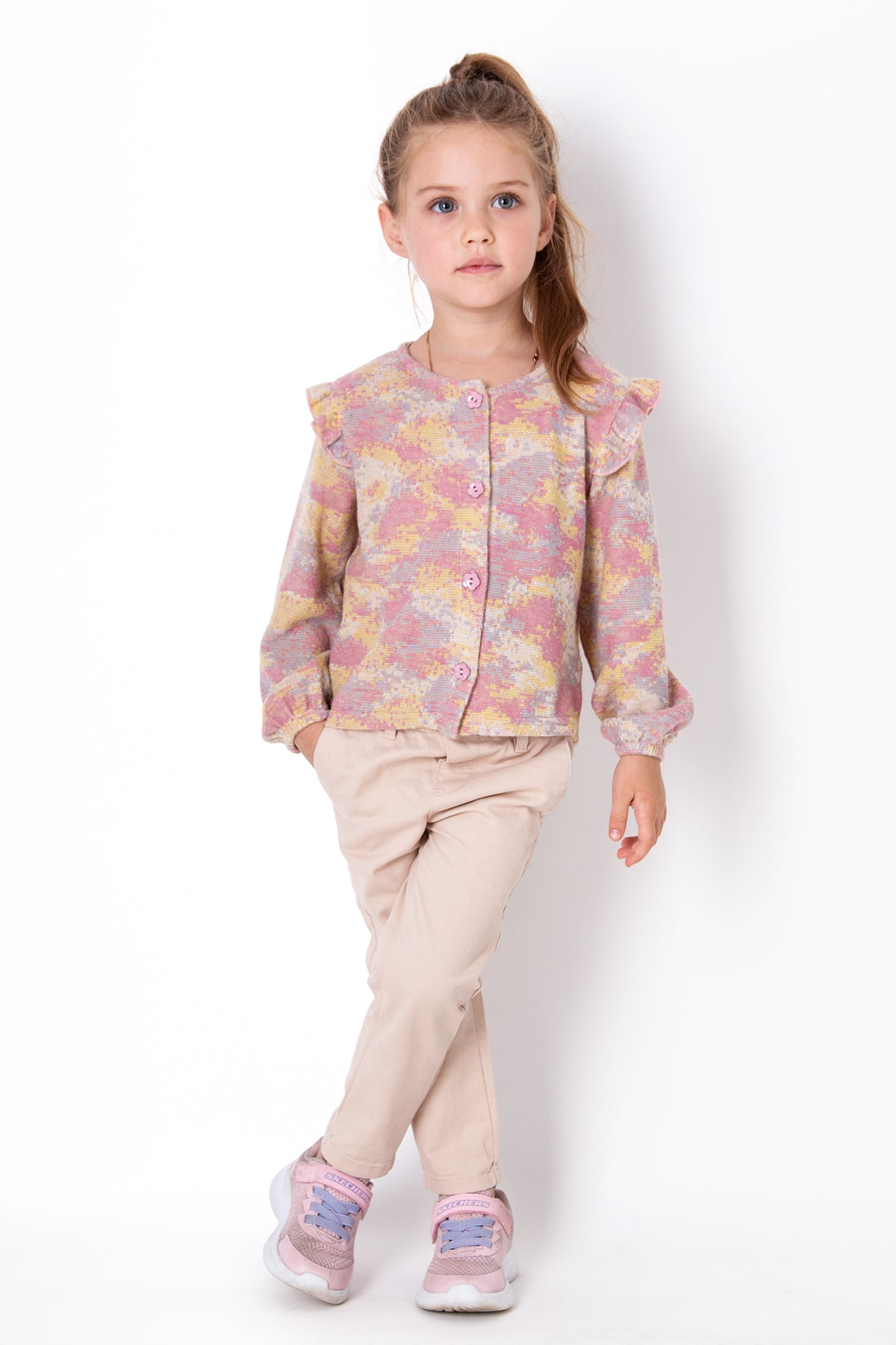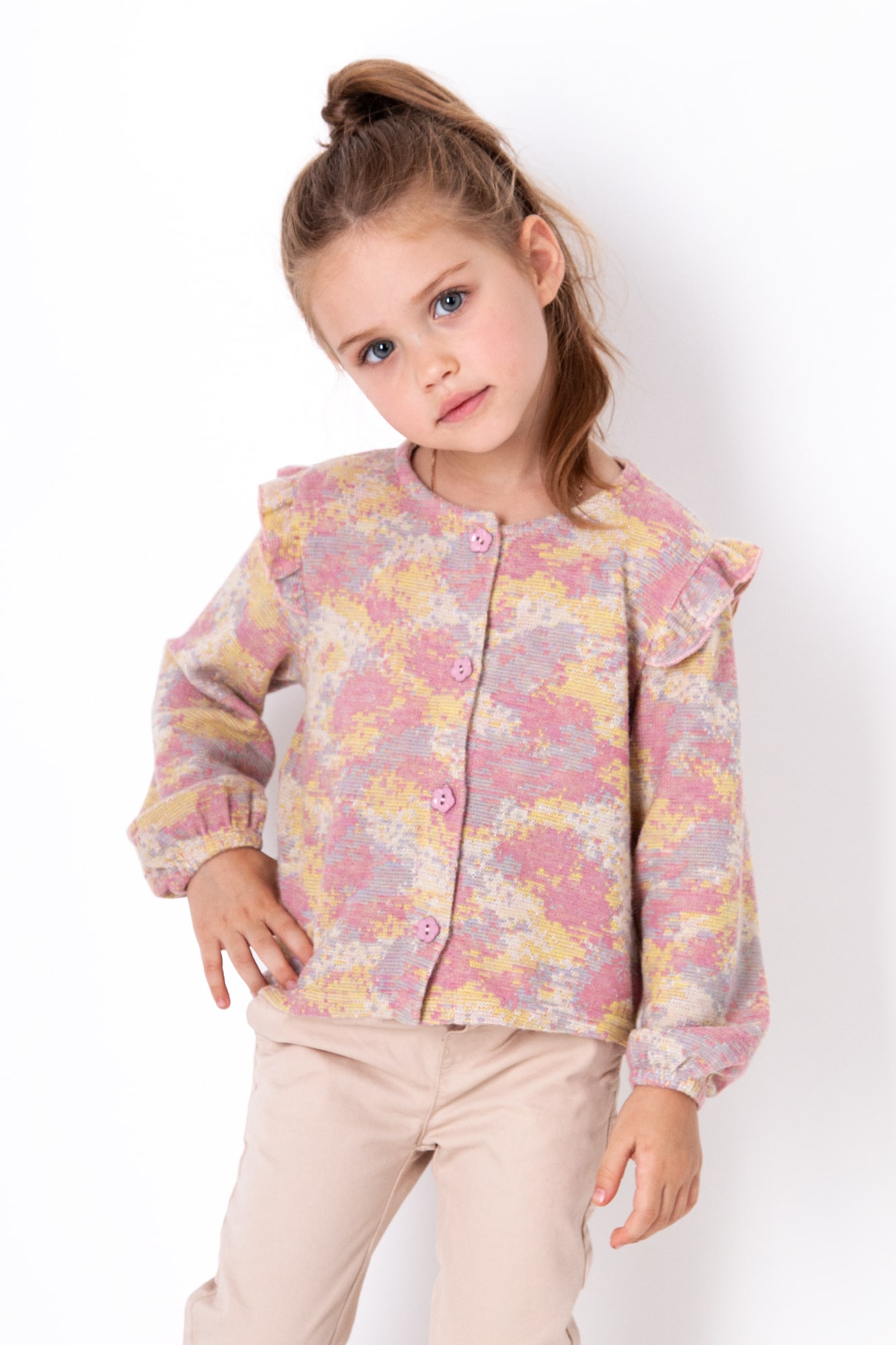 Кофта з м’якого трикотажу з абстрактним візерунком та ніжною фактурою. Декор у вигляді рюші на плечах додає образу виразності, а гудзики-квіточки — стильний акцент. Універсальна модель, яка легко поєднується з спідницями чи брюками.