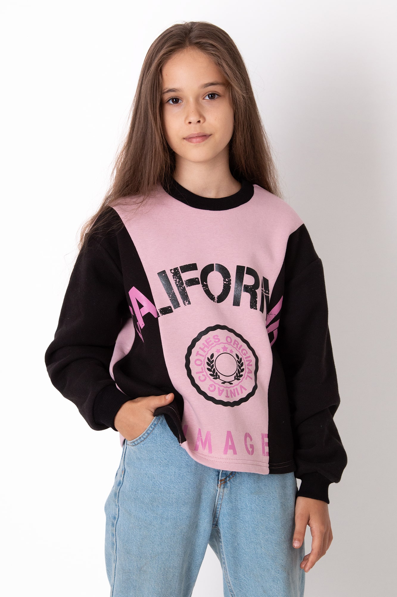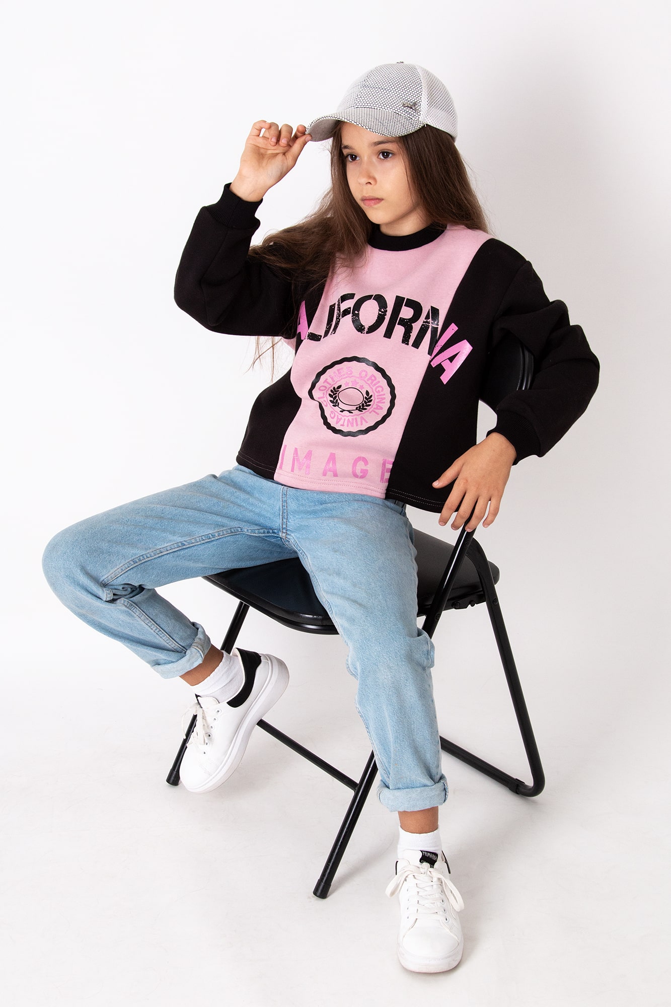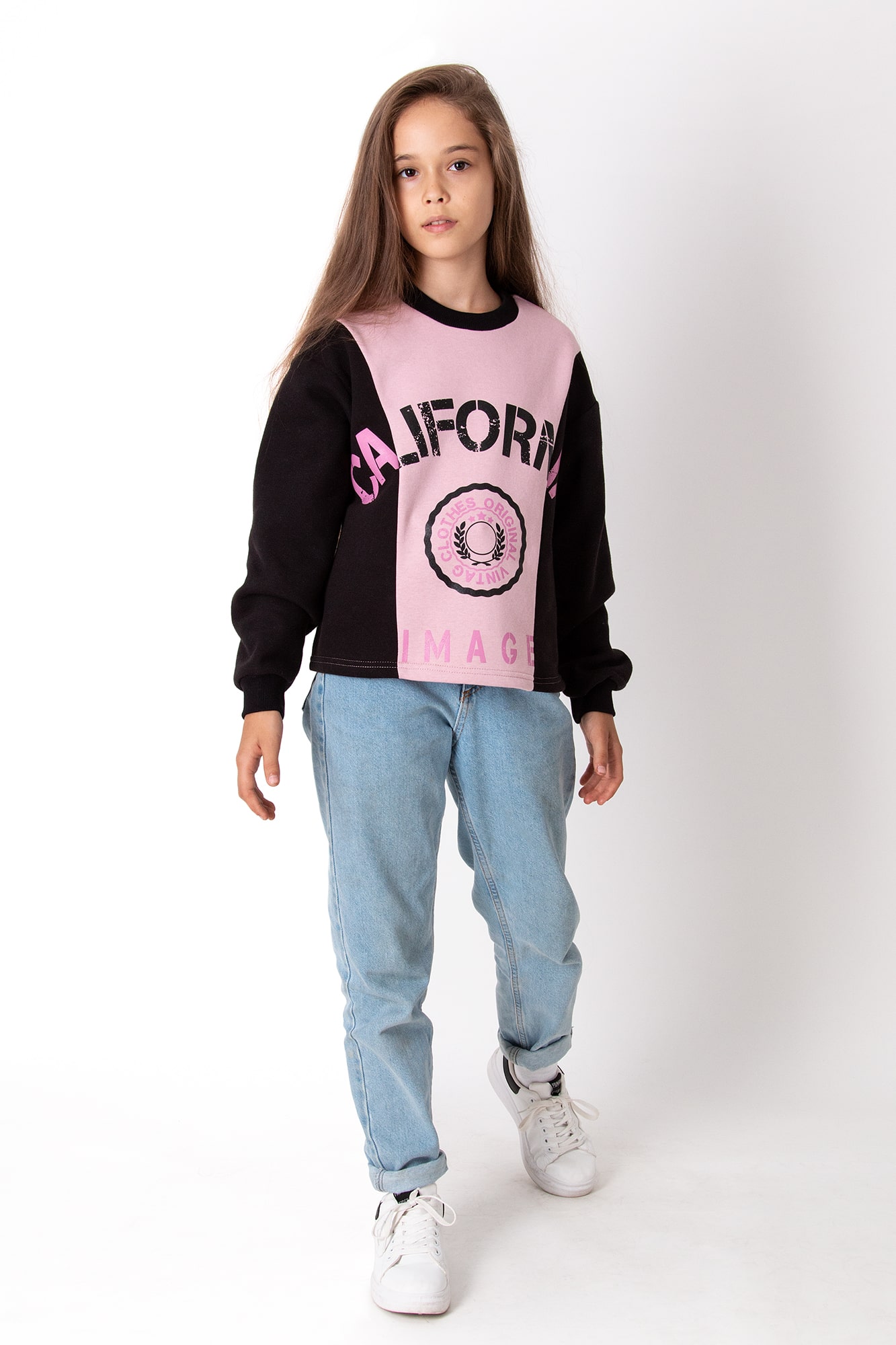 Світшот з м’якого трикотажу на флісі. Контрастна кольорова вставка з написом «CALIFORNIA» додає динаміки образу. Модель злегка вкорочена — пасує до джинсів або спортивних штанів.