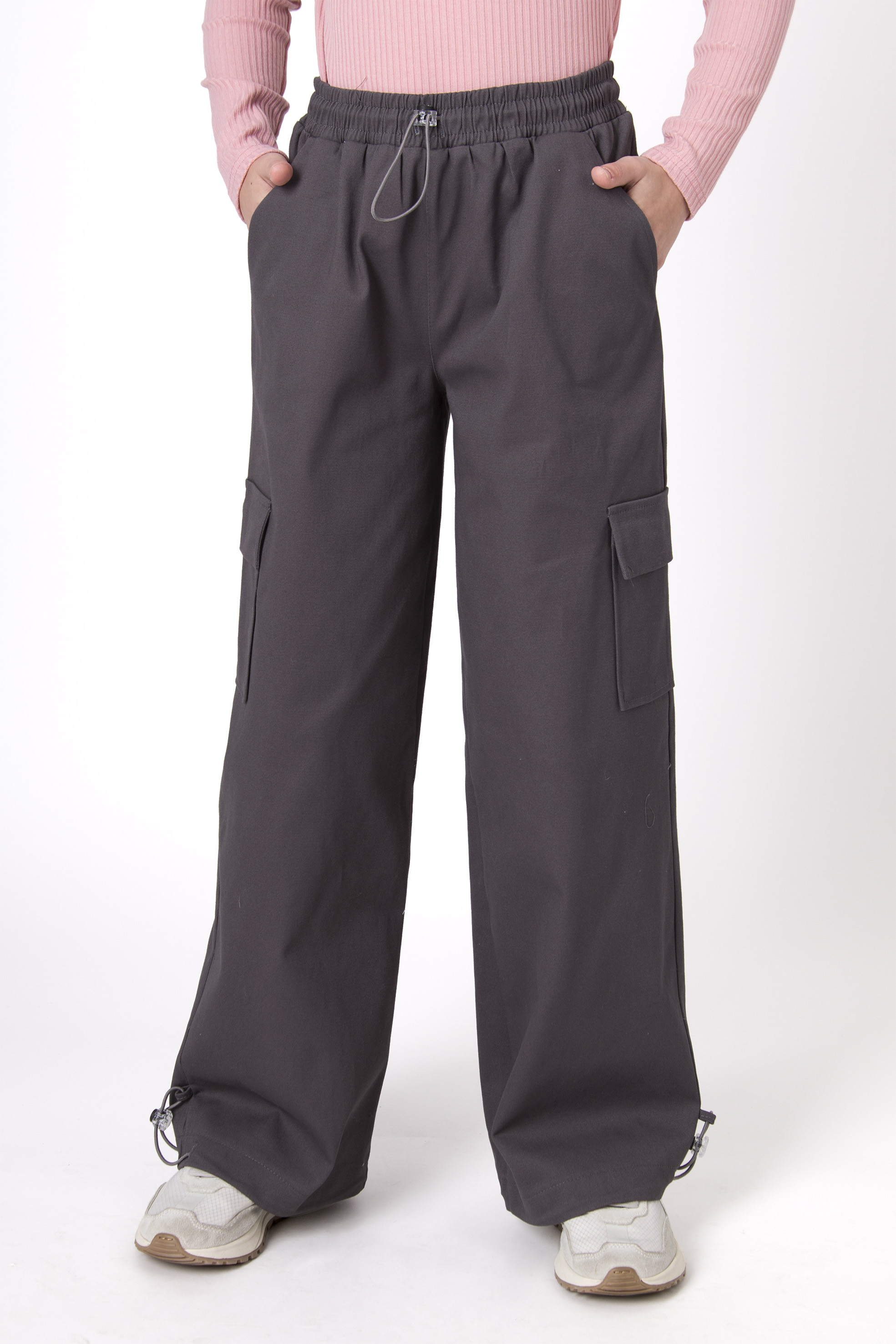 Штани-карго з широкими штанинами, зручним поясом на резинці та накладними кишенями з боків. Модель виконана з щільної тканини, яка тримає форму та виглядає стильно в повсякденних образах. Знизу є затяжки , що дозволяють носити як завʼязаними так і розвʼязаними .