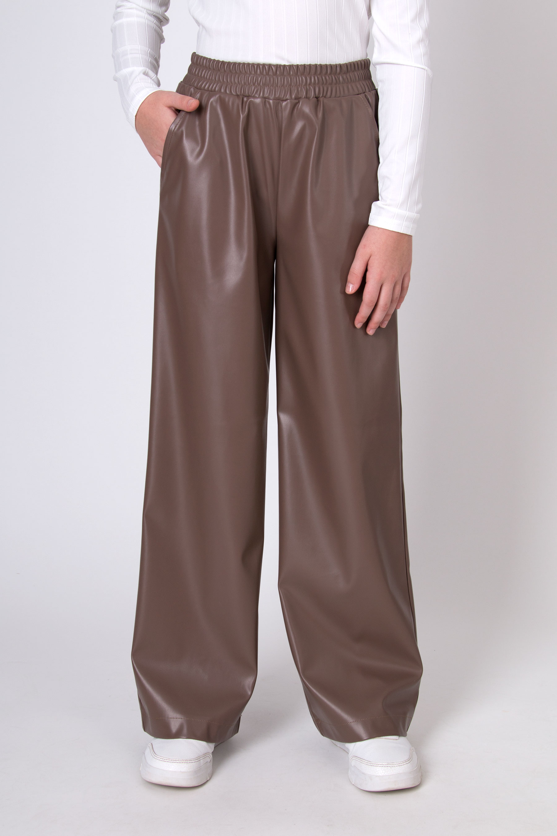 Штани з екошкіри мають легкий блиск і гладку фактуру, що додає образу виразності. Модель вільного крою з еластичним поясом на резинці забезпечує комфортну посадку. Штани з екошкіри дуже зручні , та практичні для повсякденних і стильних образів.