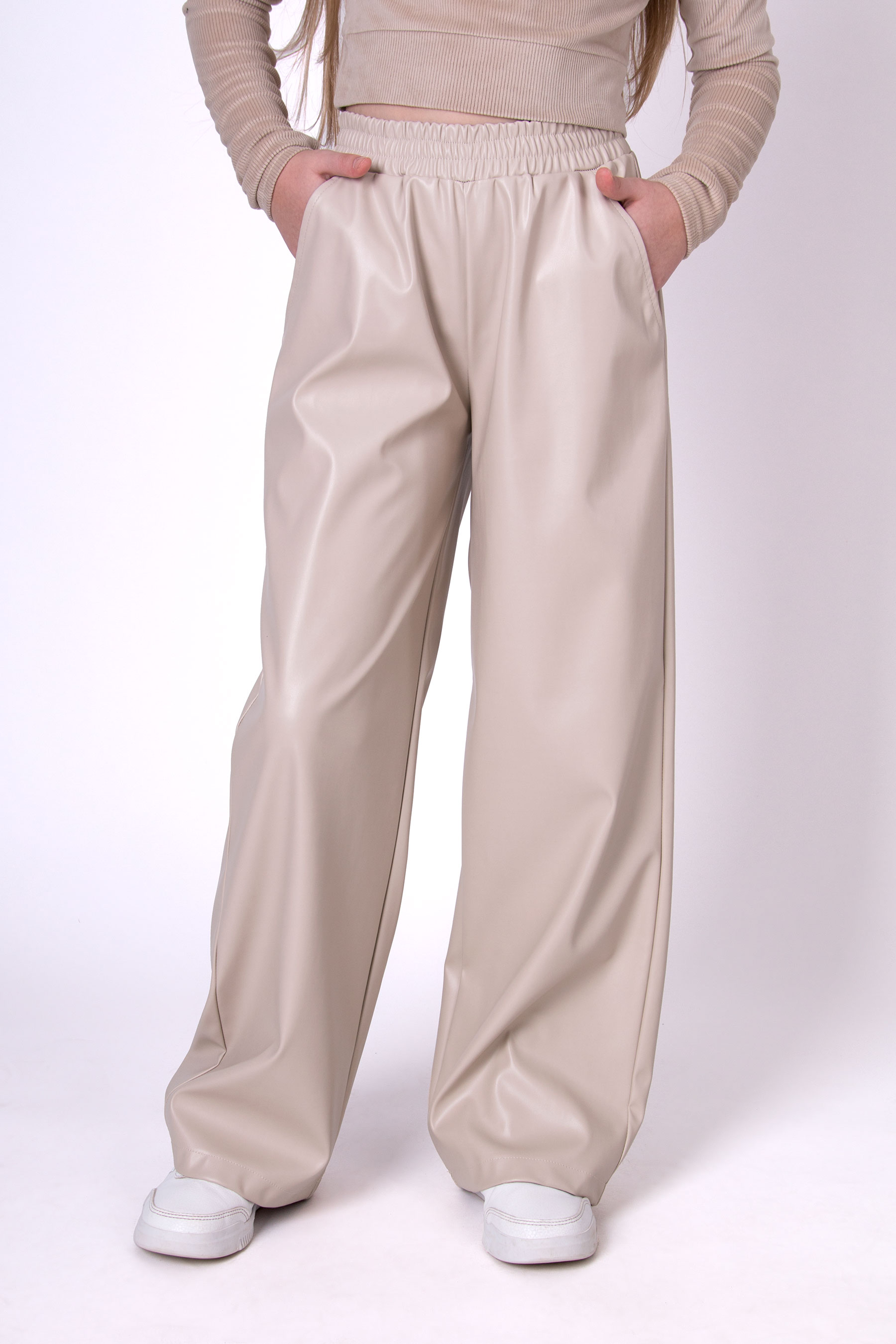 Штани з екошкіри мають легкий блиск і гладку фактуру, що додає образу виразності. Модель вільного крою з еластичним поясом на резинці забезпечує комфортну посадку. Штани з екошкіри дуже зручні , та практичні для повсякденних і стильних образів.
