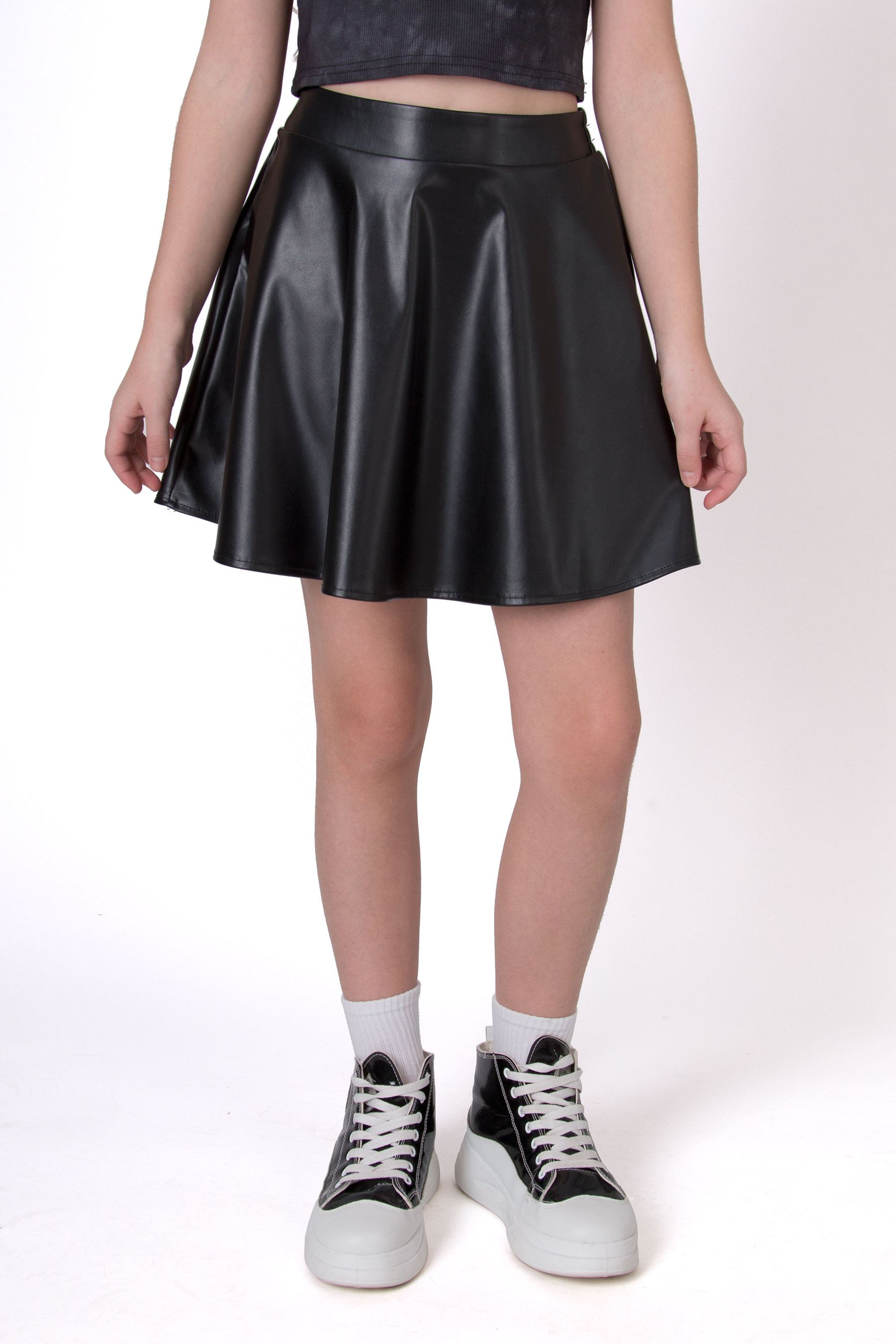 Спідниця з екошкіри у фасоні «сонце» — модний акцент у гардеробі. Матеріал має легкий блиск і гладку фактуру, що додає виробу виразності. Позаду еластичний пояс, який забезпечує зручну посадку. Спідниця виглядає стильно та підходить як для повсякденних, так і для особливих виходів.