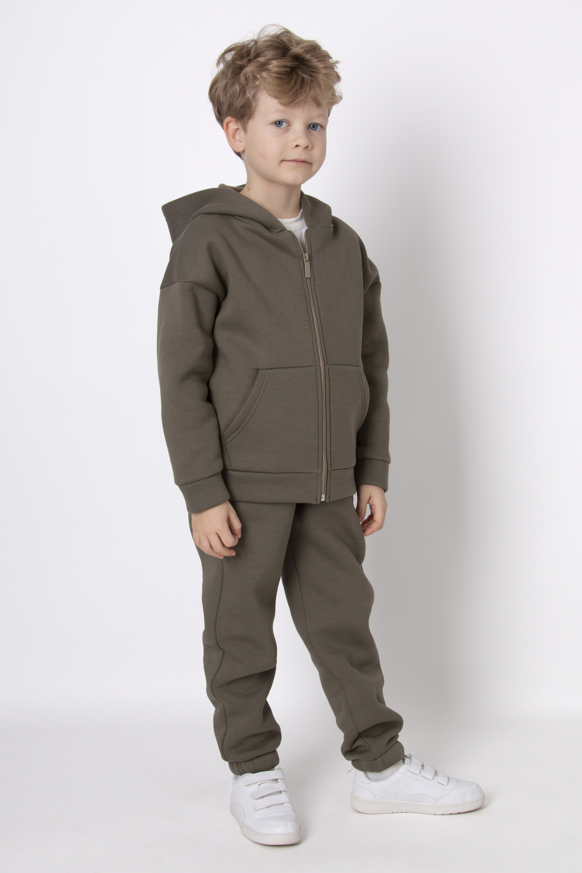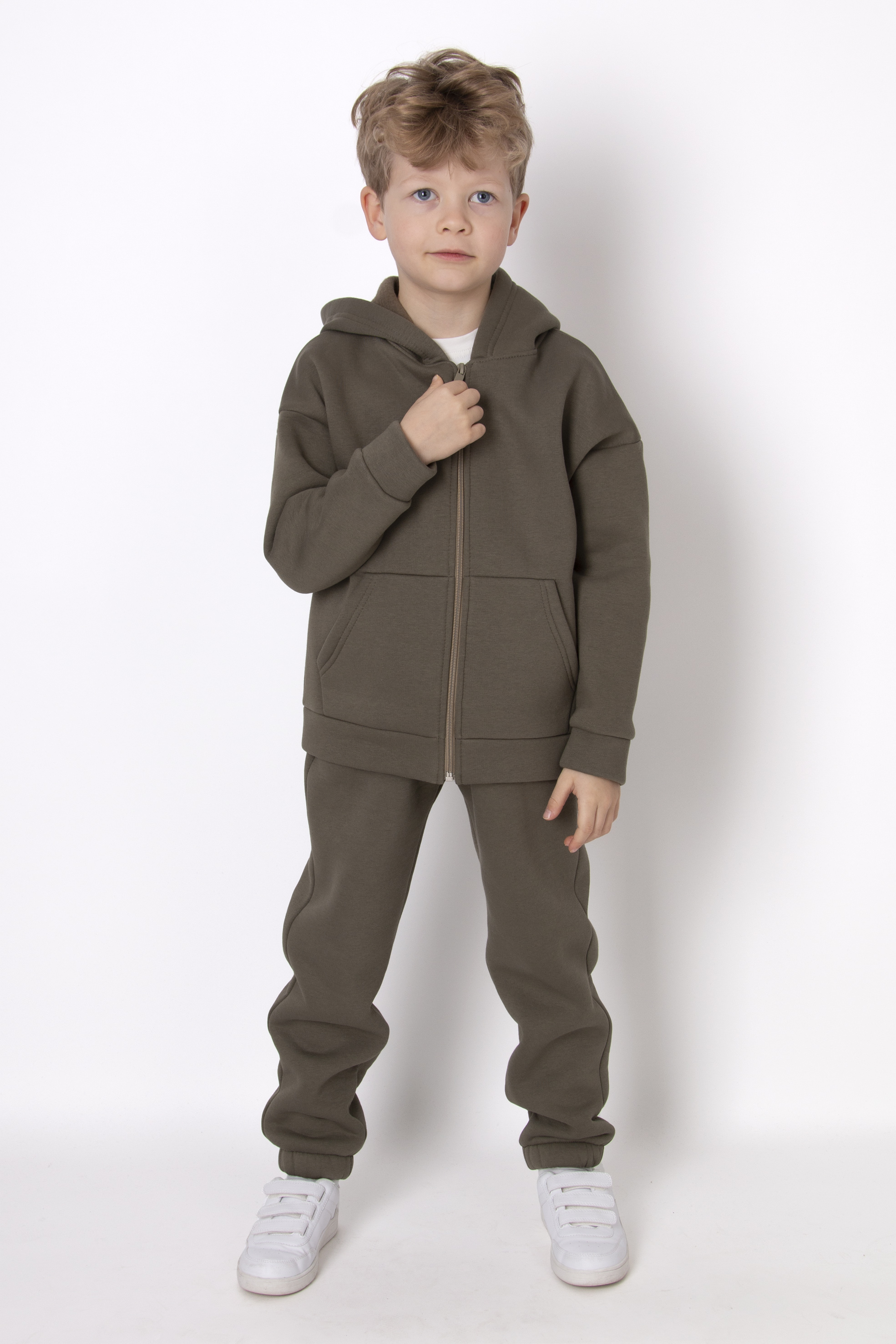 Костюм з тринитки з начосом — теплий, м’який і практичний варіант для щоденних образів. Складається з худі на блискавці з капюшоном та зручних штанів з еластичним поясом. Глибокий оливковий відтінок виглядає стильно та легко комбінується з базовим гардеробом.