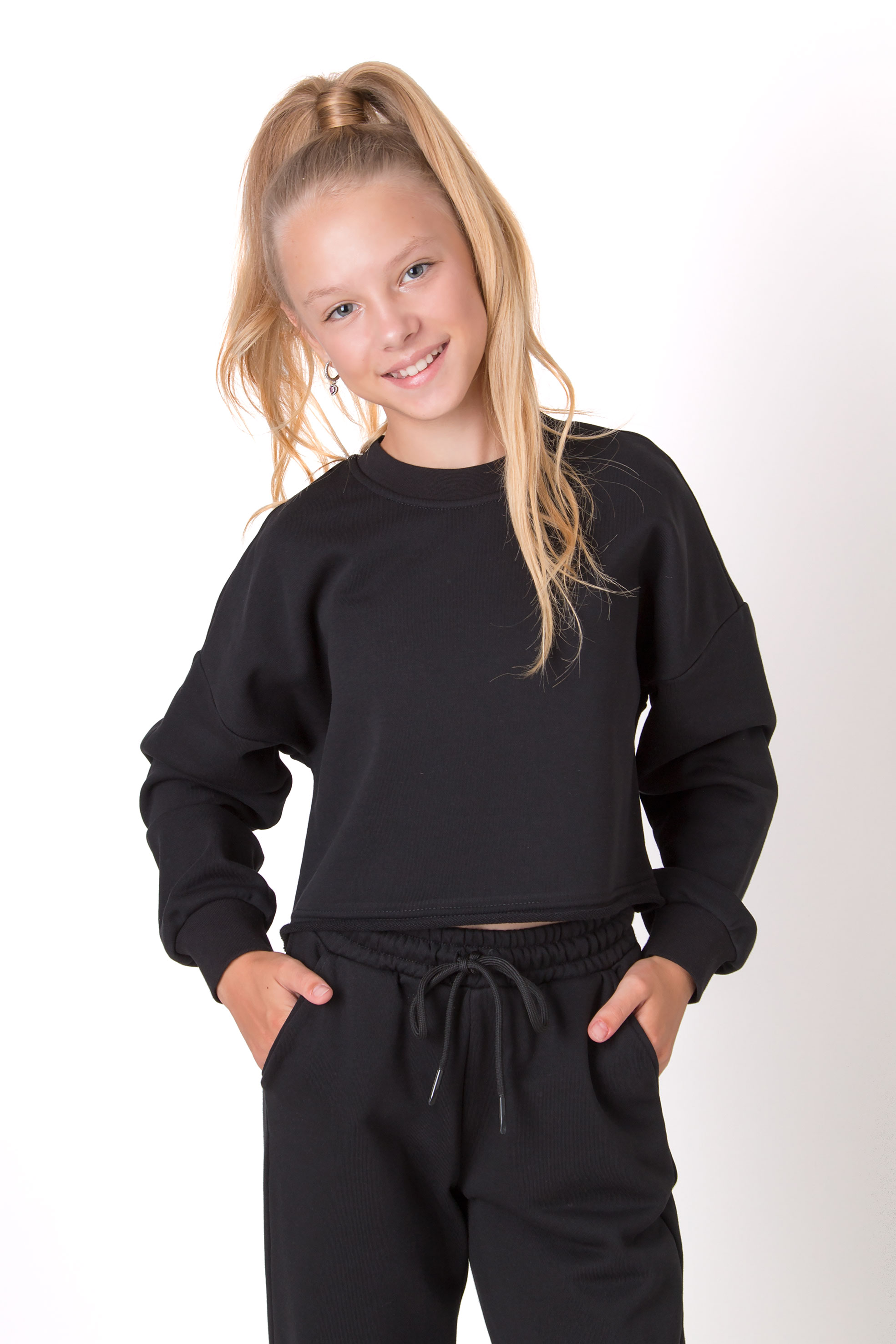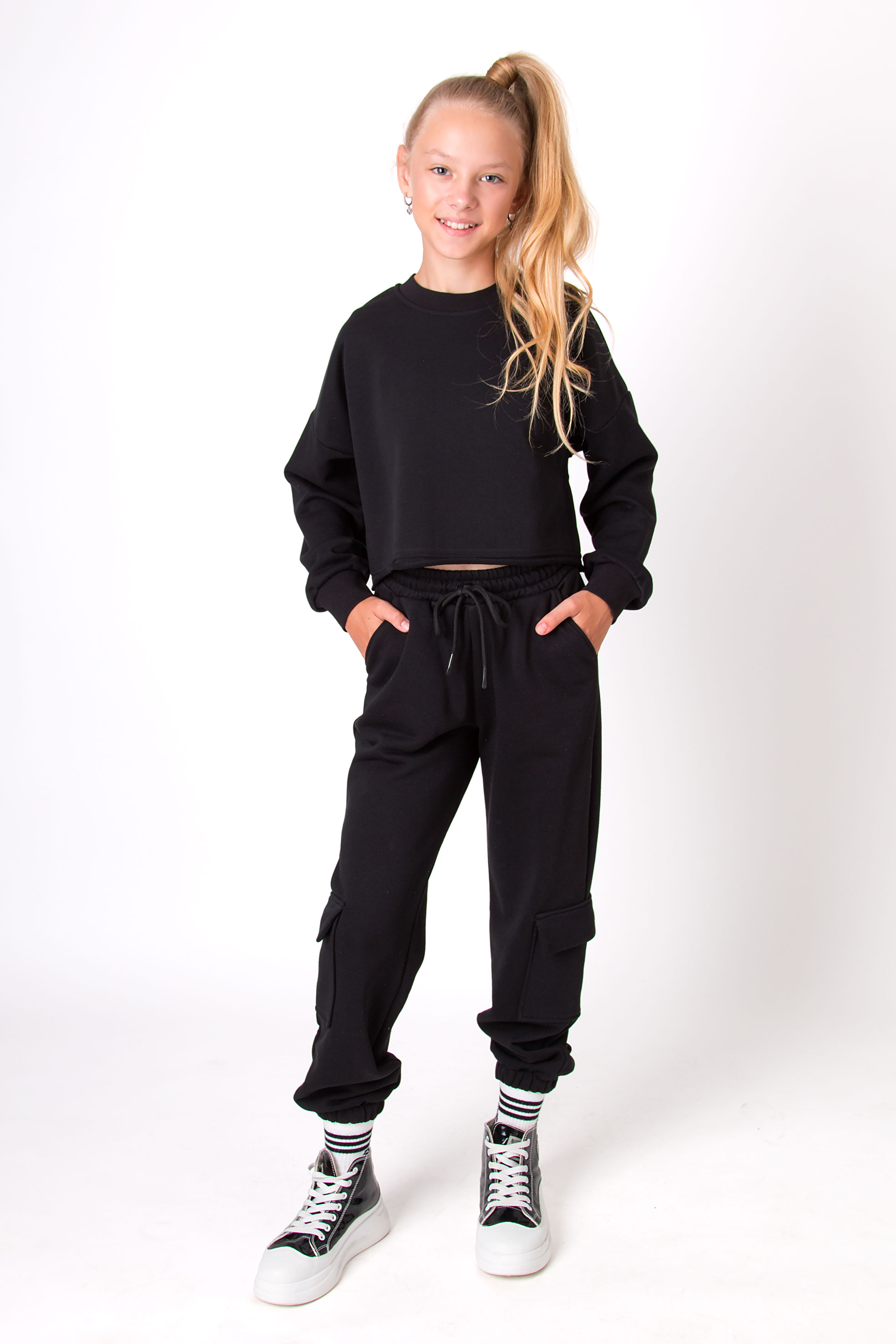 Костюм із тринитки петлі високої якості зі стильним вільним кроєм. Штани зі шнурком і накладними кишенями понизу, світшот урокорочений , зі високими манжетами на рукавах. Сучасний, зручний і впевнений образ на кожен день.