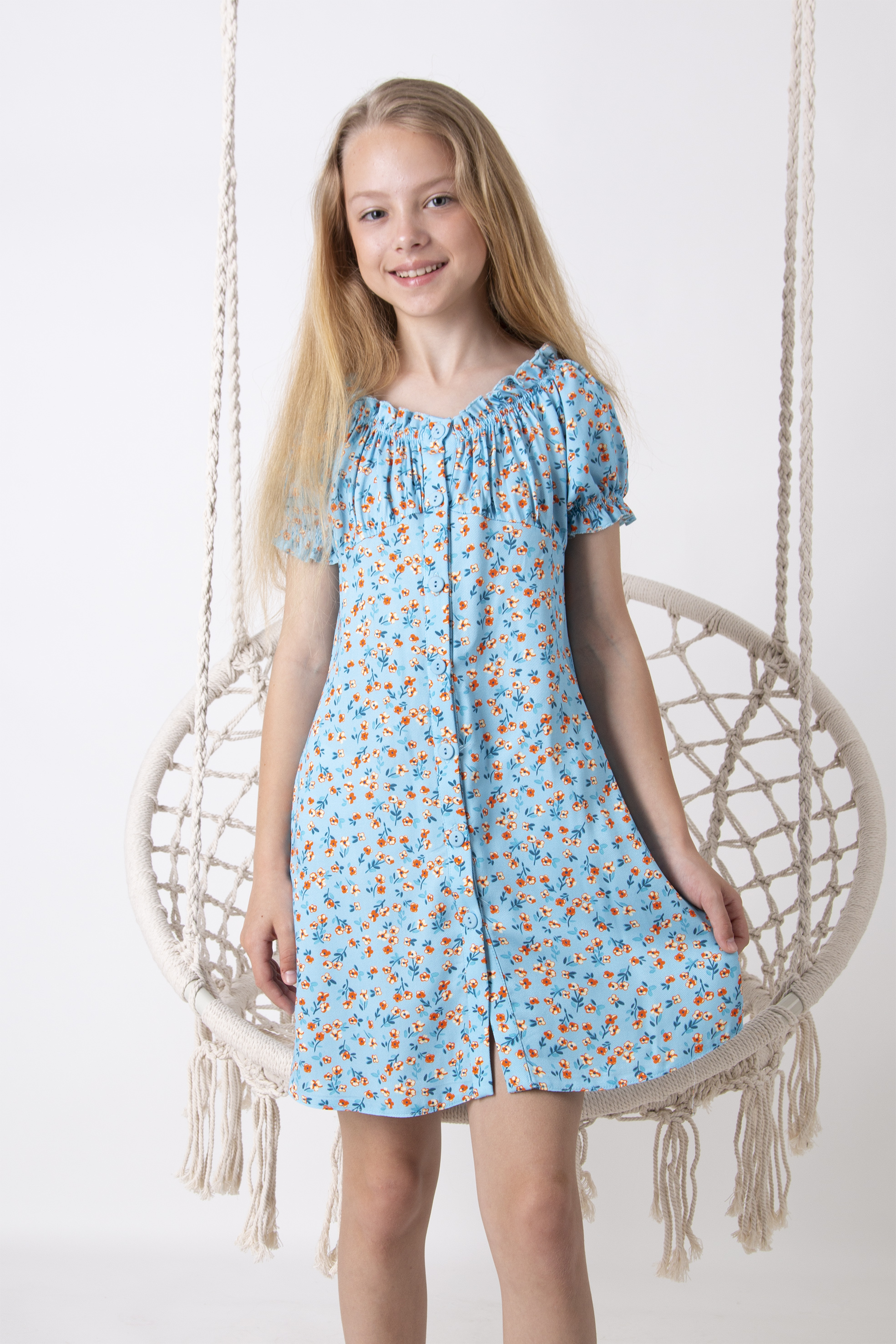 Cукня з тканини штапель твіл. Округла горловина зі зборкою. Застібка на ґудзики спереду. Короткий рукав. Прямий крій. Довжина вище коліна. Квітковий принт.