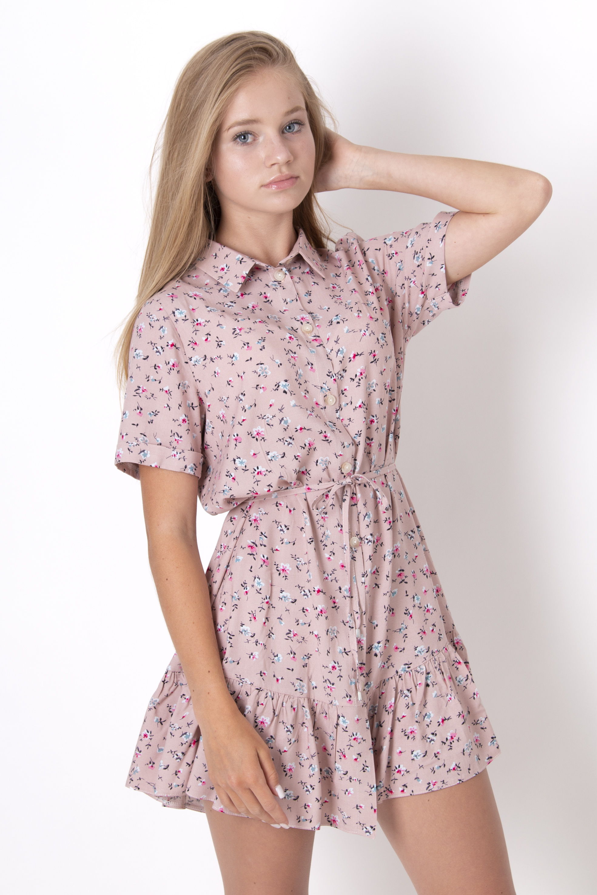 Cукня з тканини штапель. Відкладний комір, застібка на ґудзики спереду. Короткий рукав. Пояс із основної тканини. Нижня частина з оборкою. Квітковий принт. Довжина вище коліна.