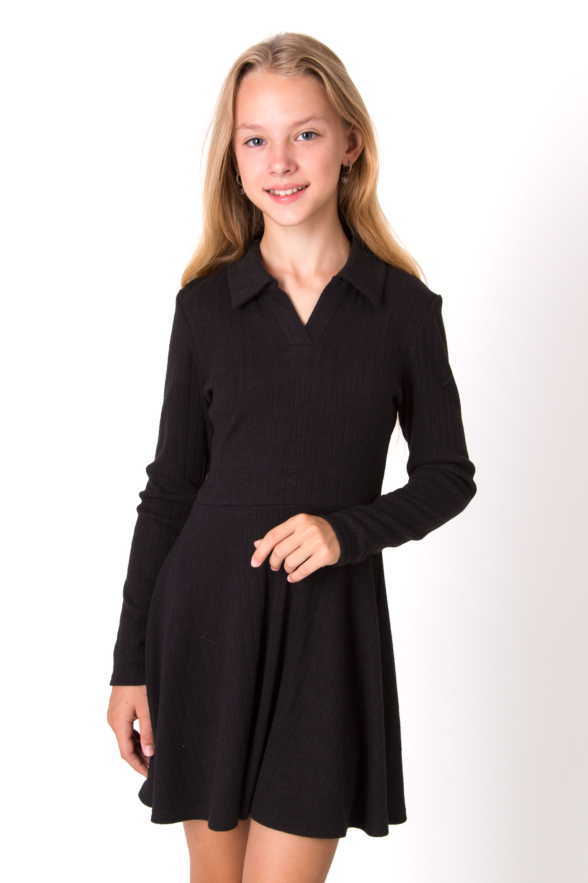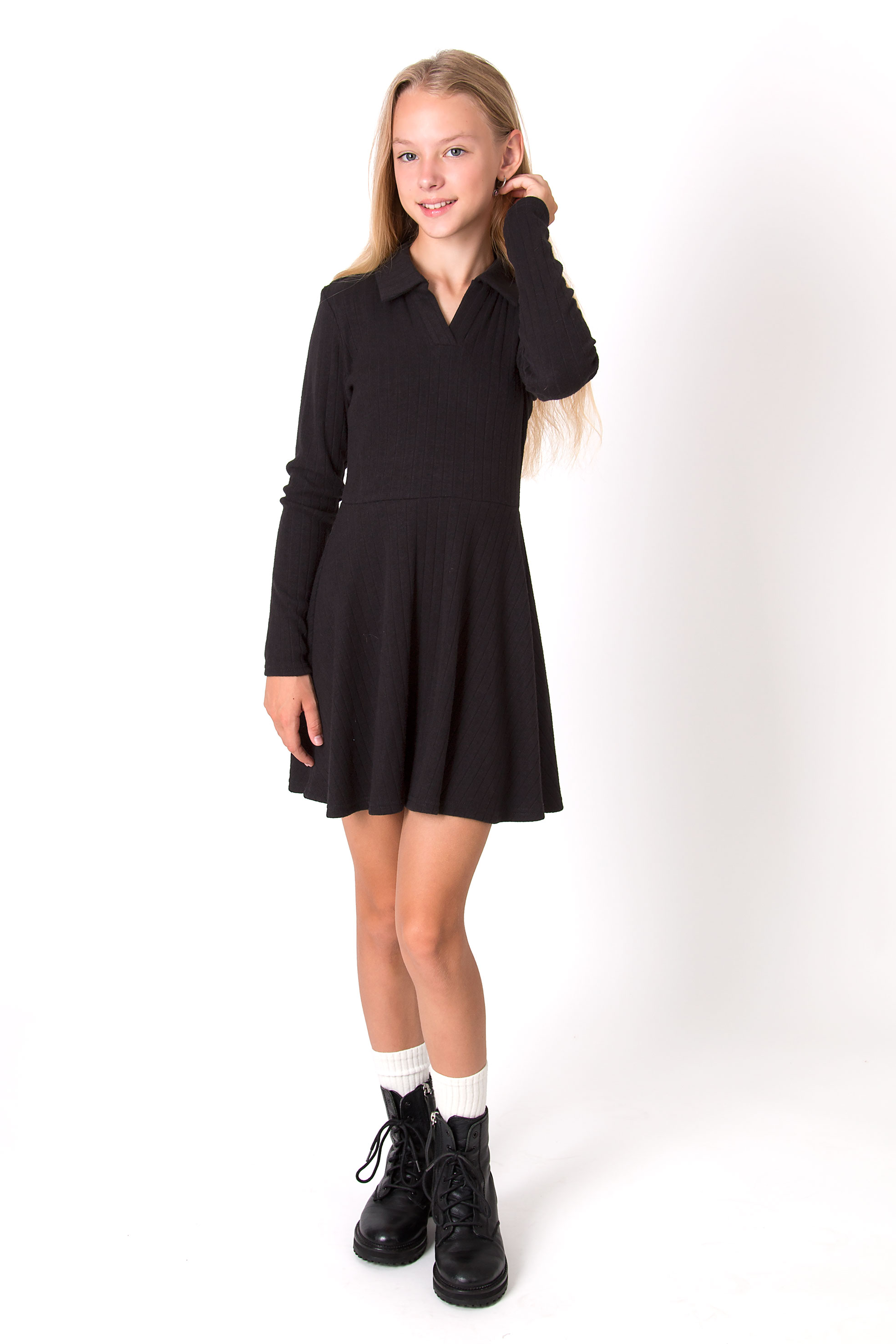 Сукня з трикотажної тканини, у складі якої віскоза. Модель із коміром та V-подібним вирізом, довгими рукавами і спідницею «сонце». Легка, зручна й водночас елегантна — гарний вибір на кожен день або для особливого приводу.