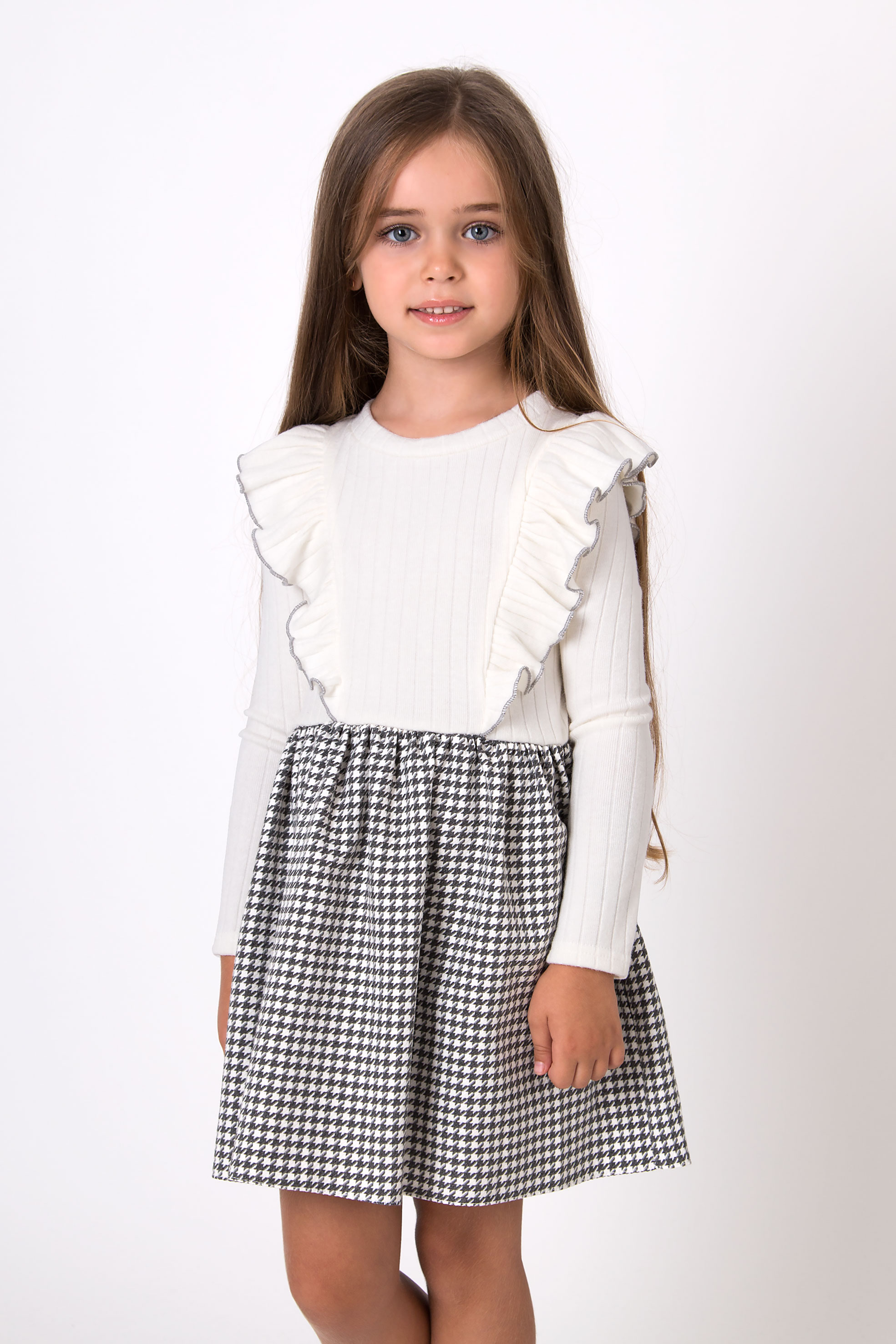 Сукня з м’якої трикотажної тканини. Верх оздоблений об’ємними рюшами, що додають ніжності, а спідниця з класичним візерунком «гусина лапка» створює елегантний контраст. Ідеальний варіант для стильного повсякденного образу.