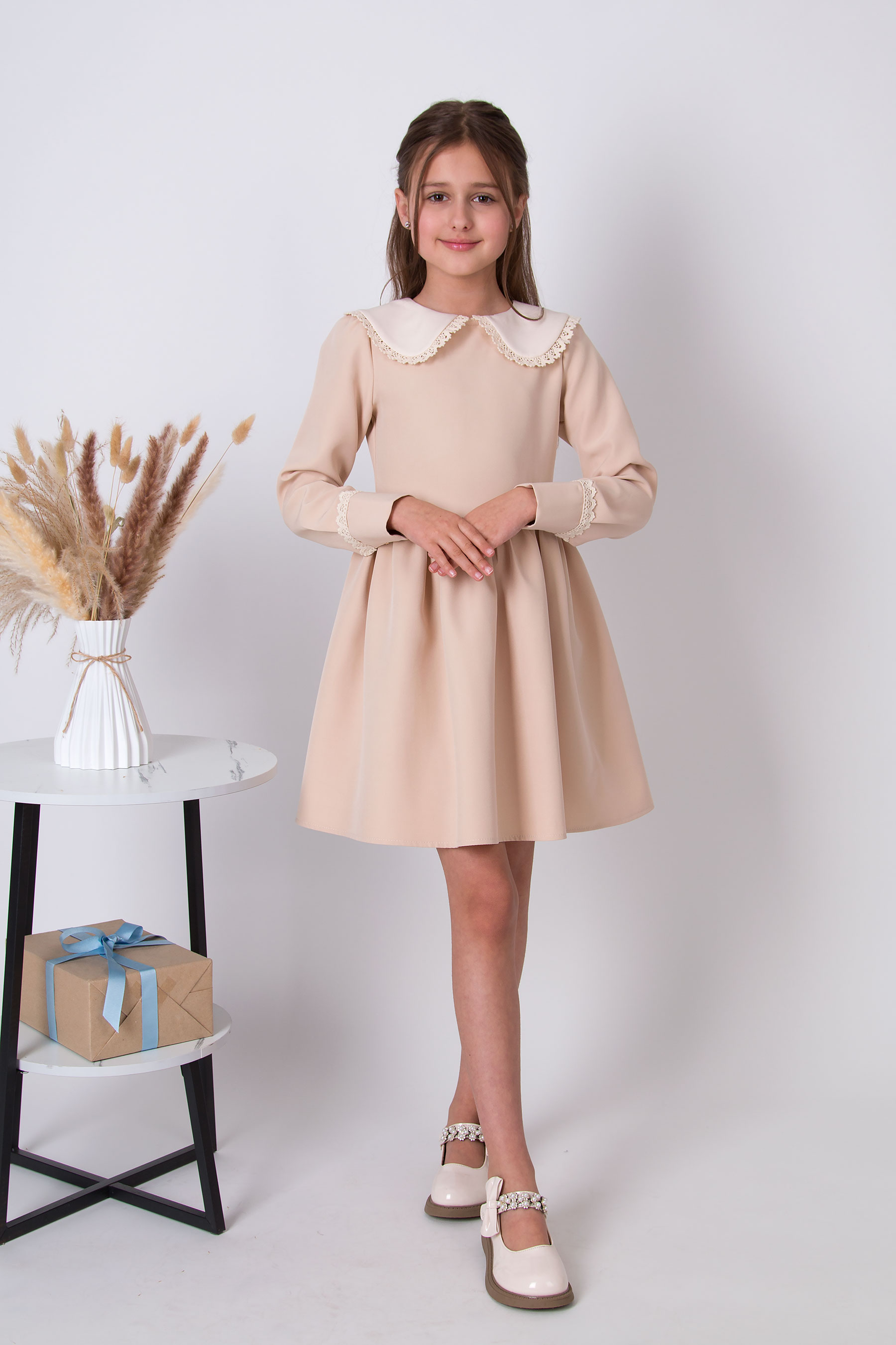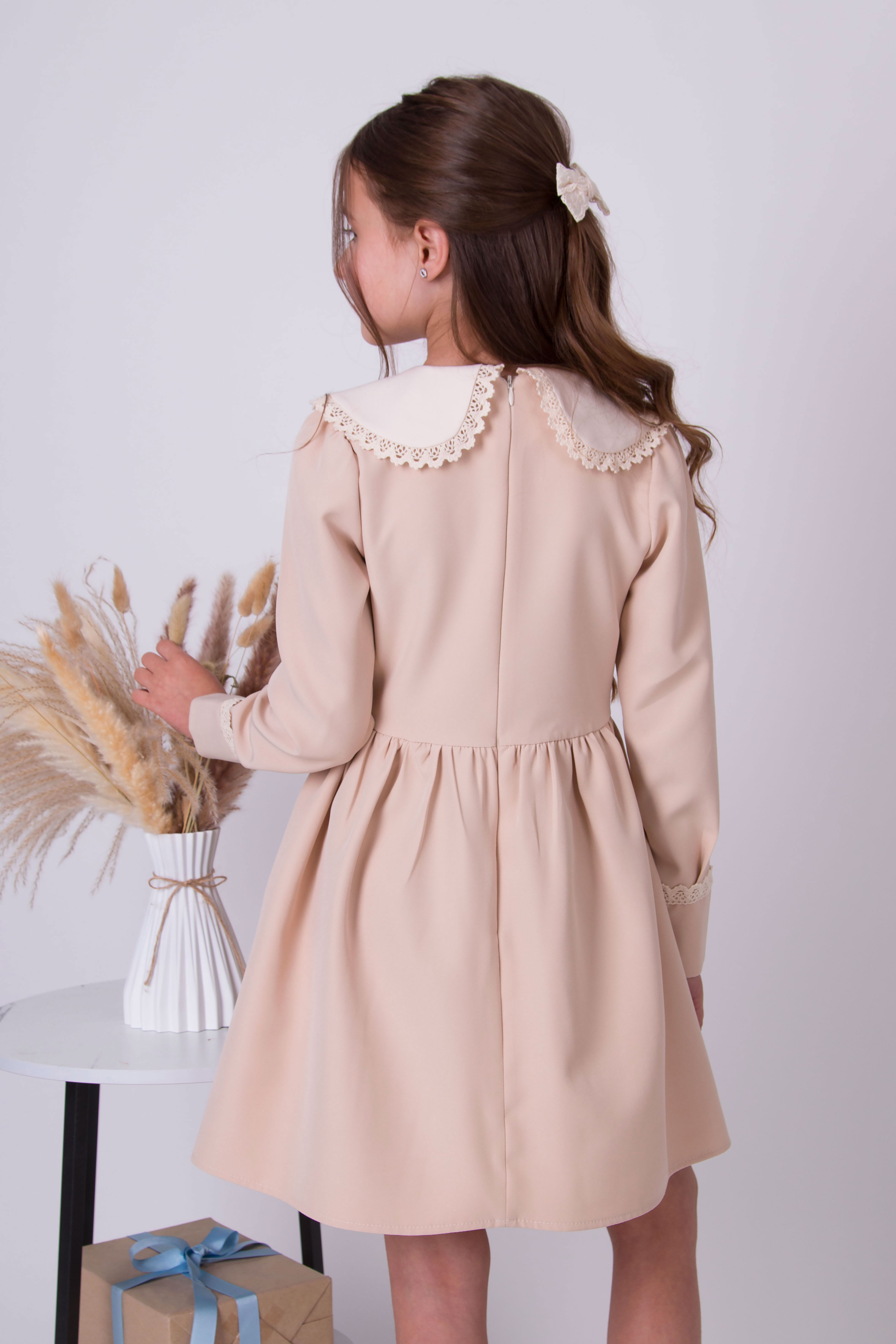 Елегантна сукня з костюмної тканини з довгими рукавами та відрізною лінією талії без резинки, що формує акуратний силует. Декоративний комірець та манжети оздоблені мереживом доповнюють образ, м’які складки на спідниці додають образу ніжності й вишуканості.