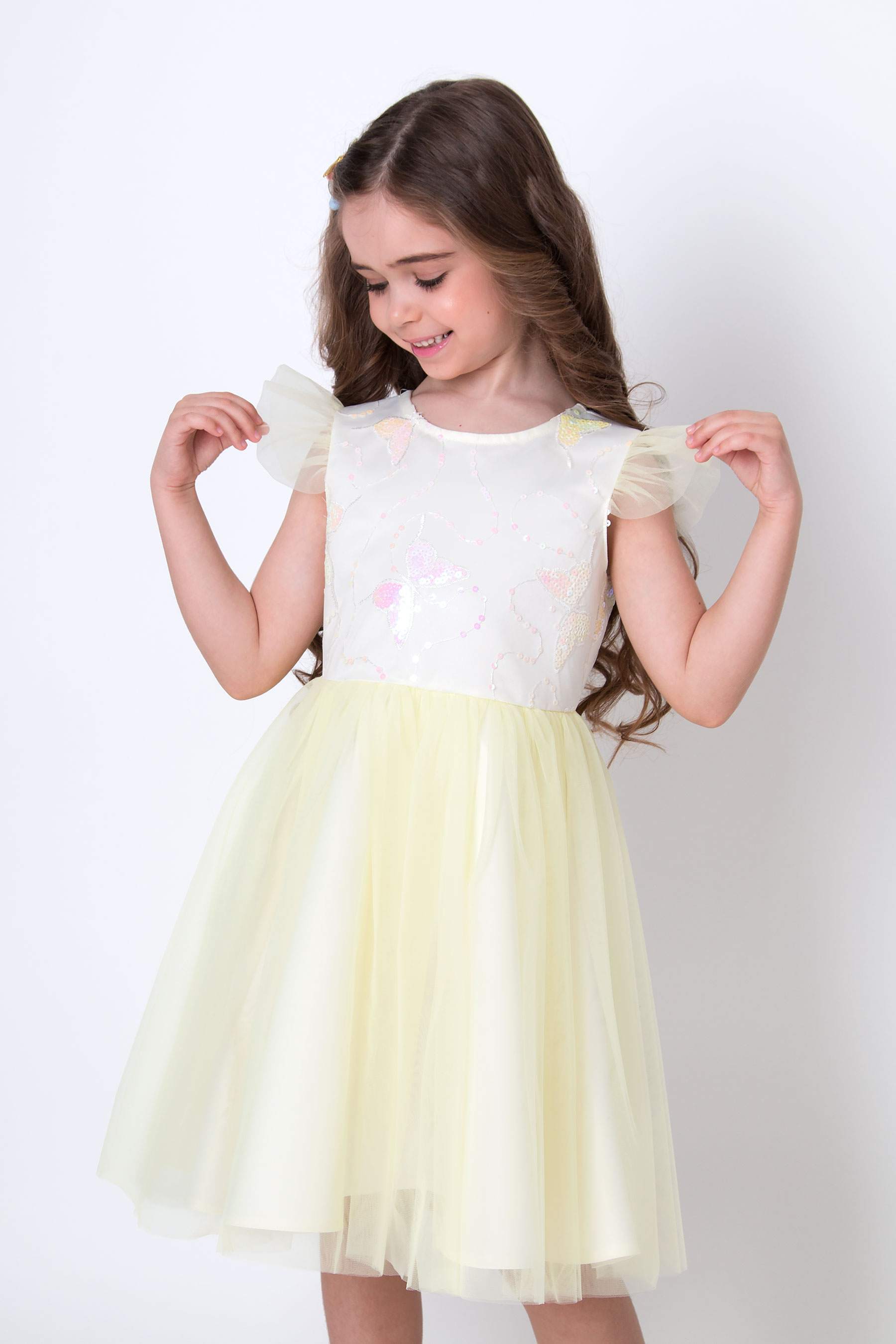 Сукня для дівчинки з поєднанням атласного верху та багатошарової спідниці із сітки. Верх виконаний з гладкого атласу з декоративним принтом, по плечах — напівпрозорі крильця з м’якої сітки. Лінія талії відрізна, спідниця пишна, добре тримає форму за рахунок кількох шарів сітки. На спинці передбачена застібка-блискавка.