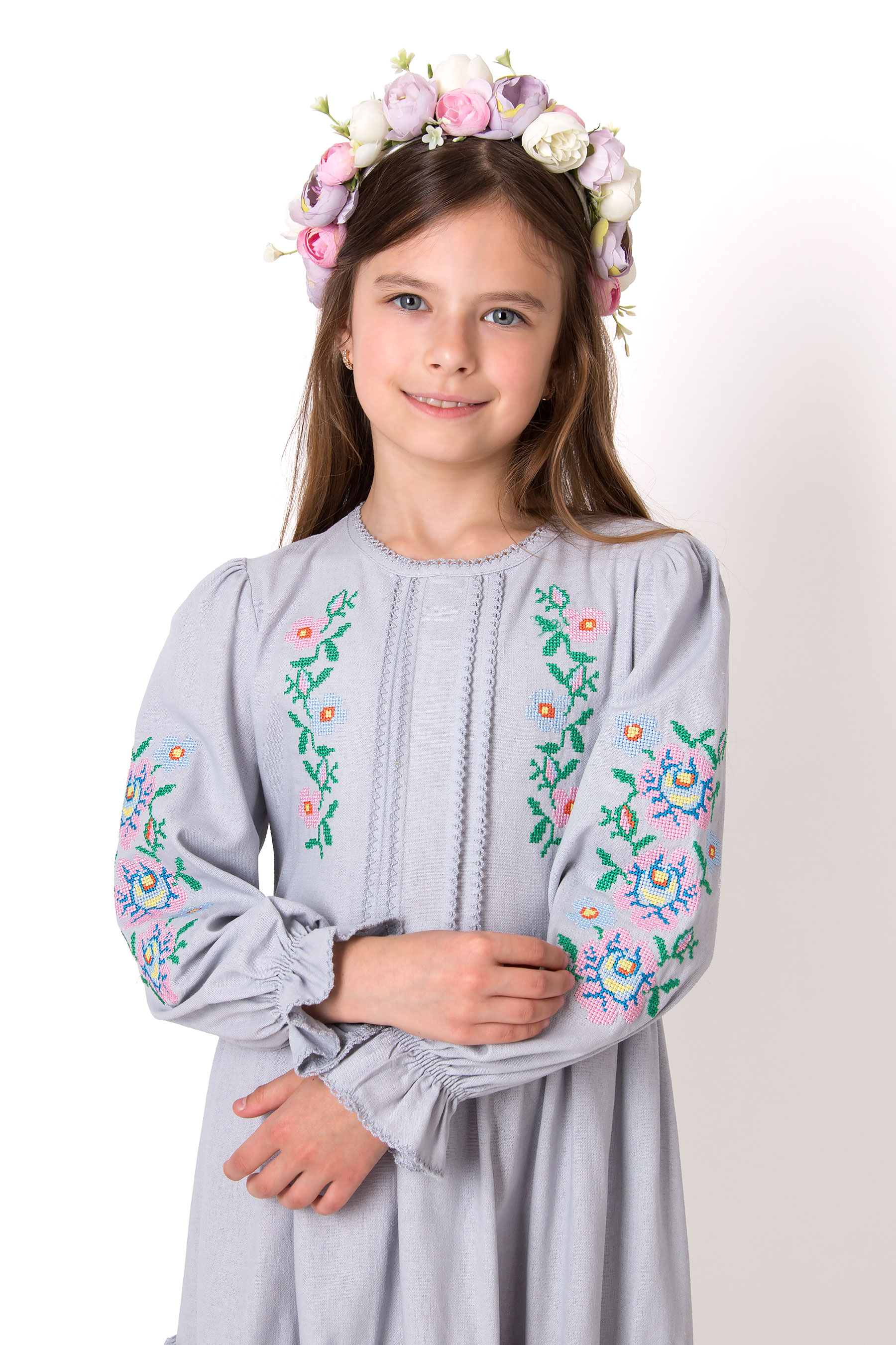 Дитяча сукня-вишиванка з льону з ніжною вишивкою квітів на рукавах і грудях. Модель має приталений силует, ззаду застібається на тасьму-блискавку, рукави — на манжетах із рюшею. Ідеальний вибір для святкових подій або стильних повсякденних образів.