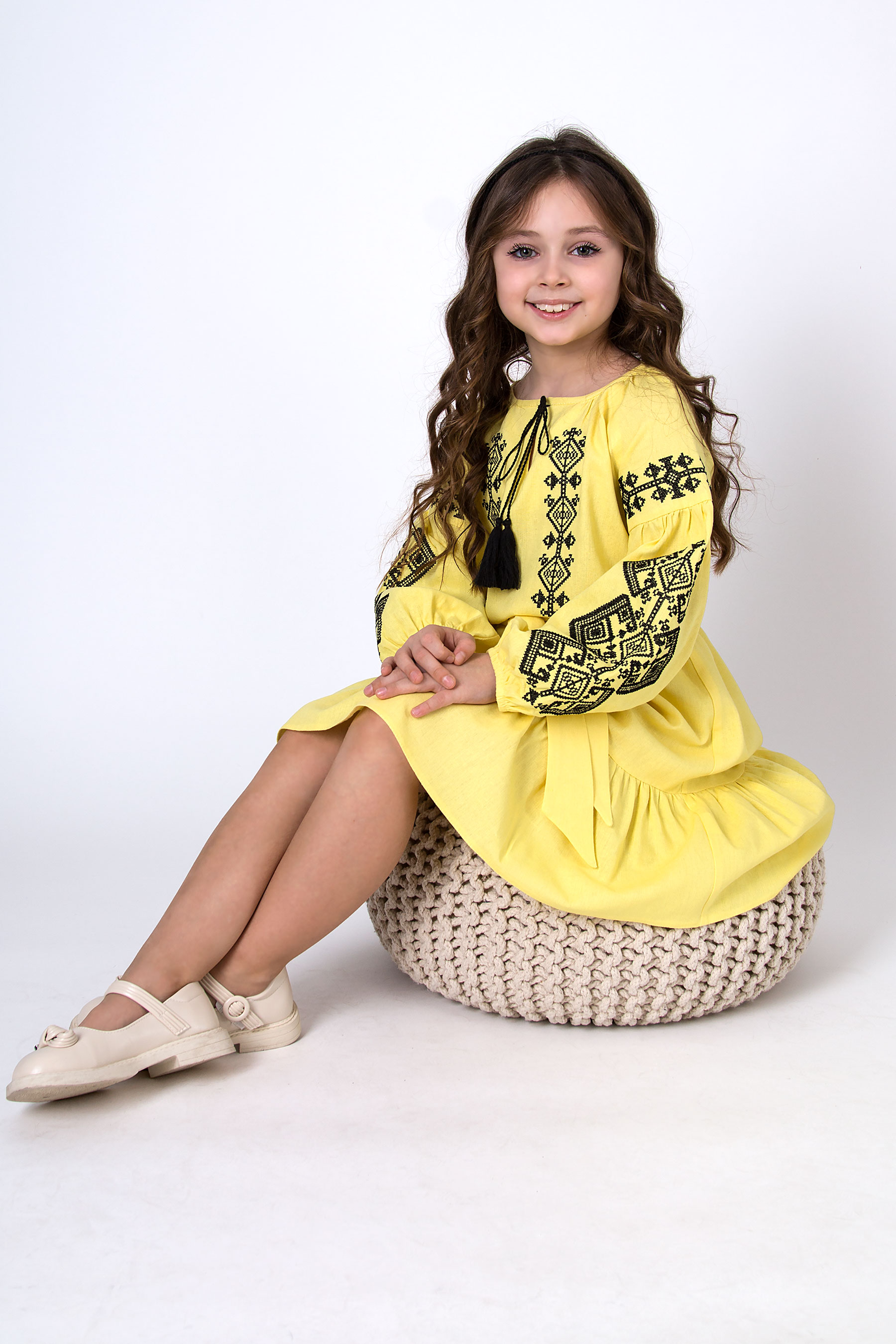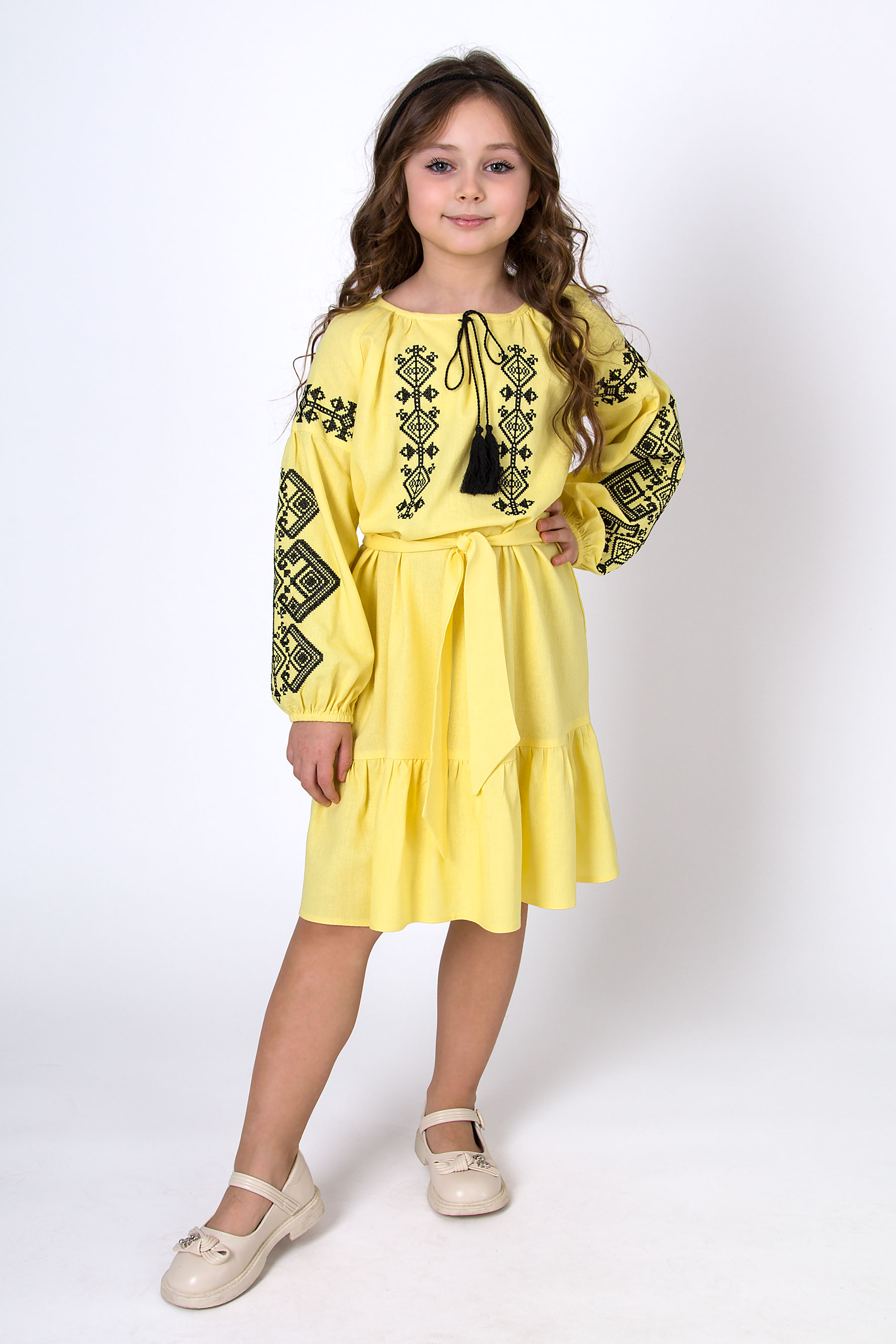 Сукня-вишиванка з льону. Модель вільного крою з поясом, що м’яко підкреслює талію. Горловина зав’язується китицями, а рукави оздоблені вишивкою з етномотивами. Легкий силует і продуманий дизайн створюють гармонійний образ для різних подій. Ця сукня поєднує традиційні символи української культури з комфортом сучасного одягу — з любов’ю до коріння і стилю.