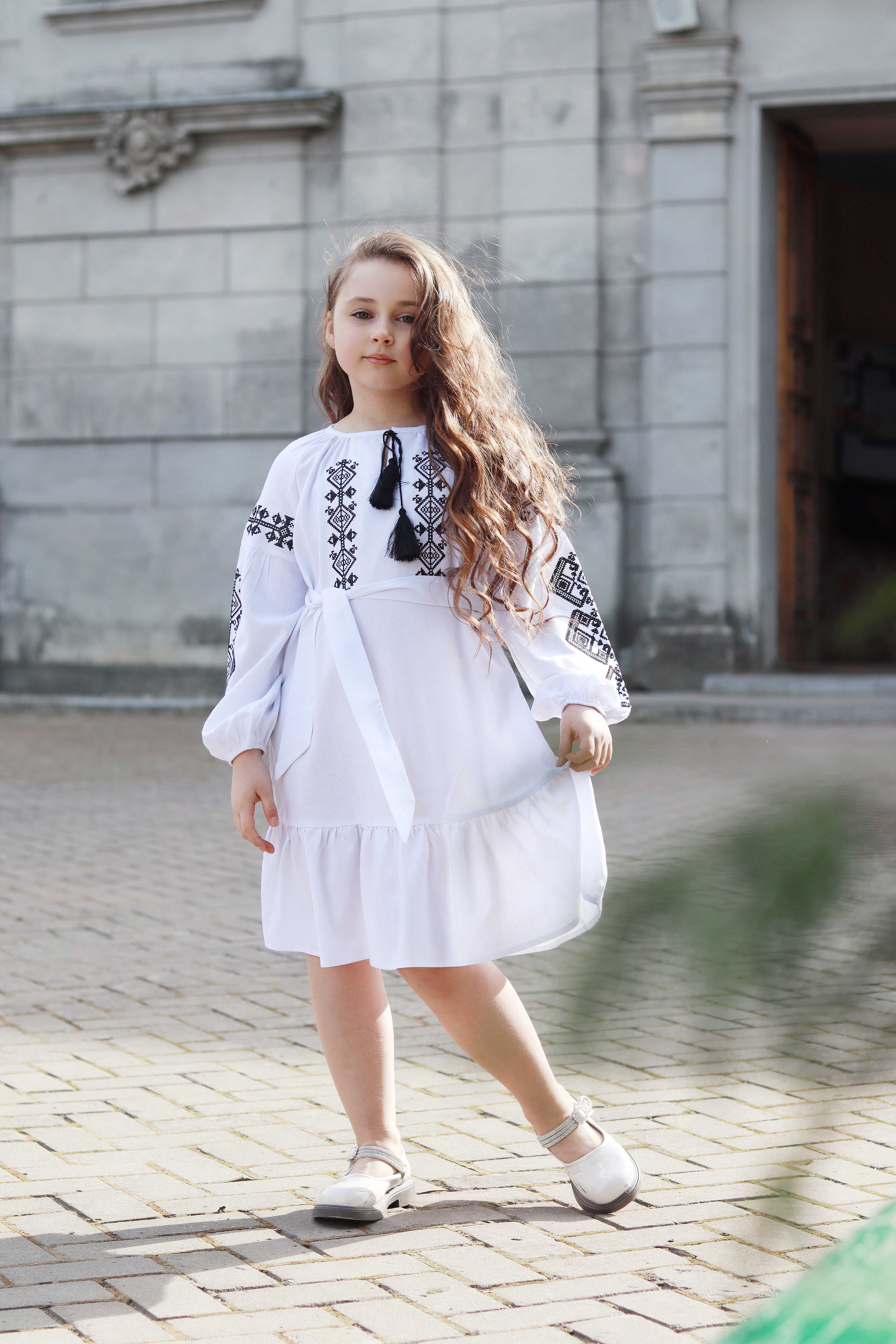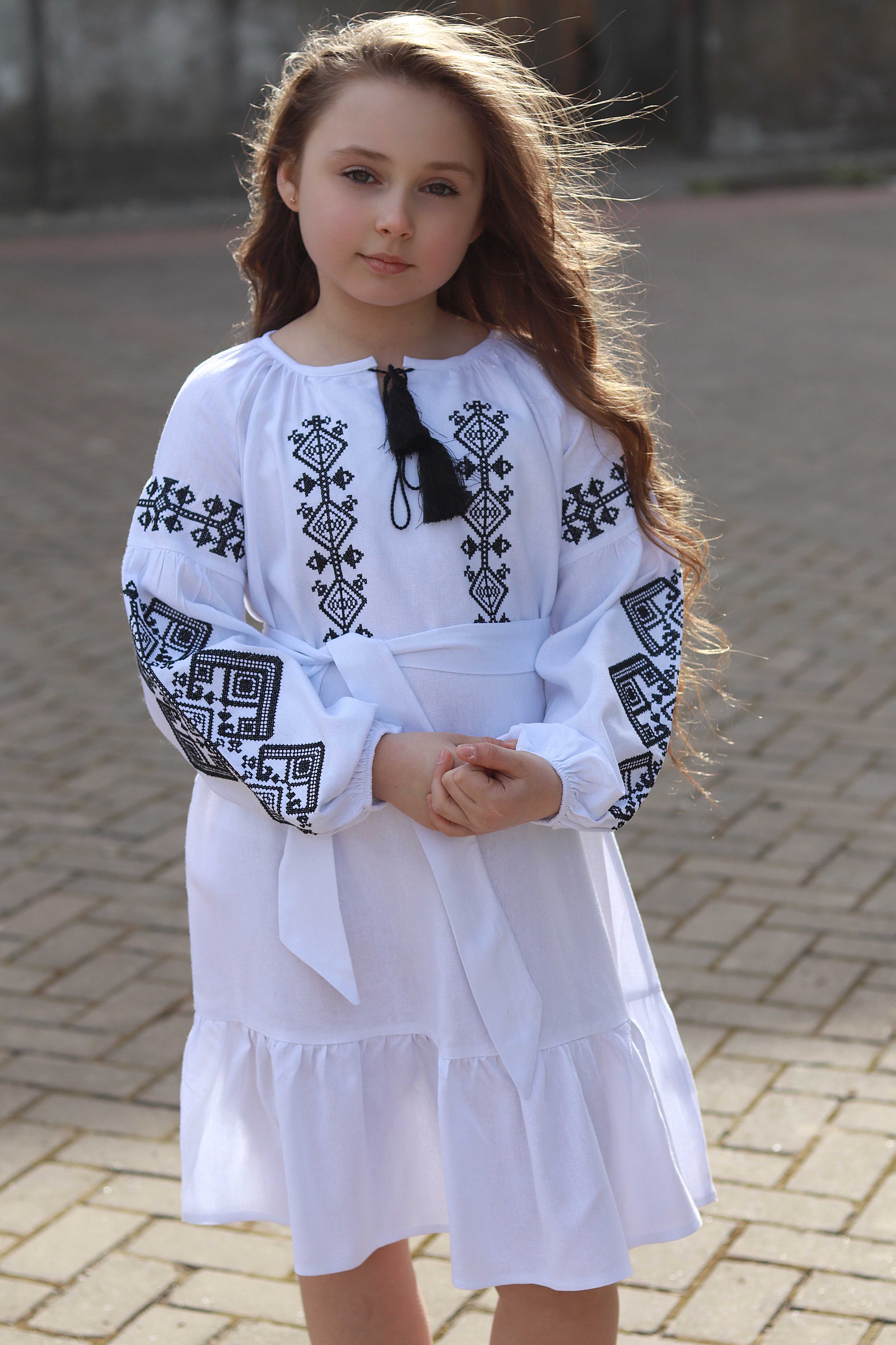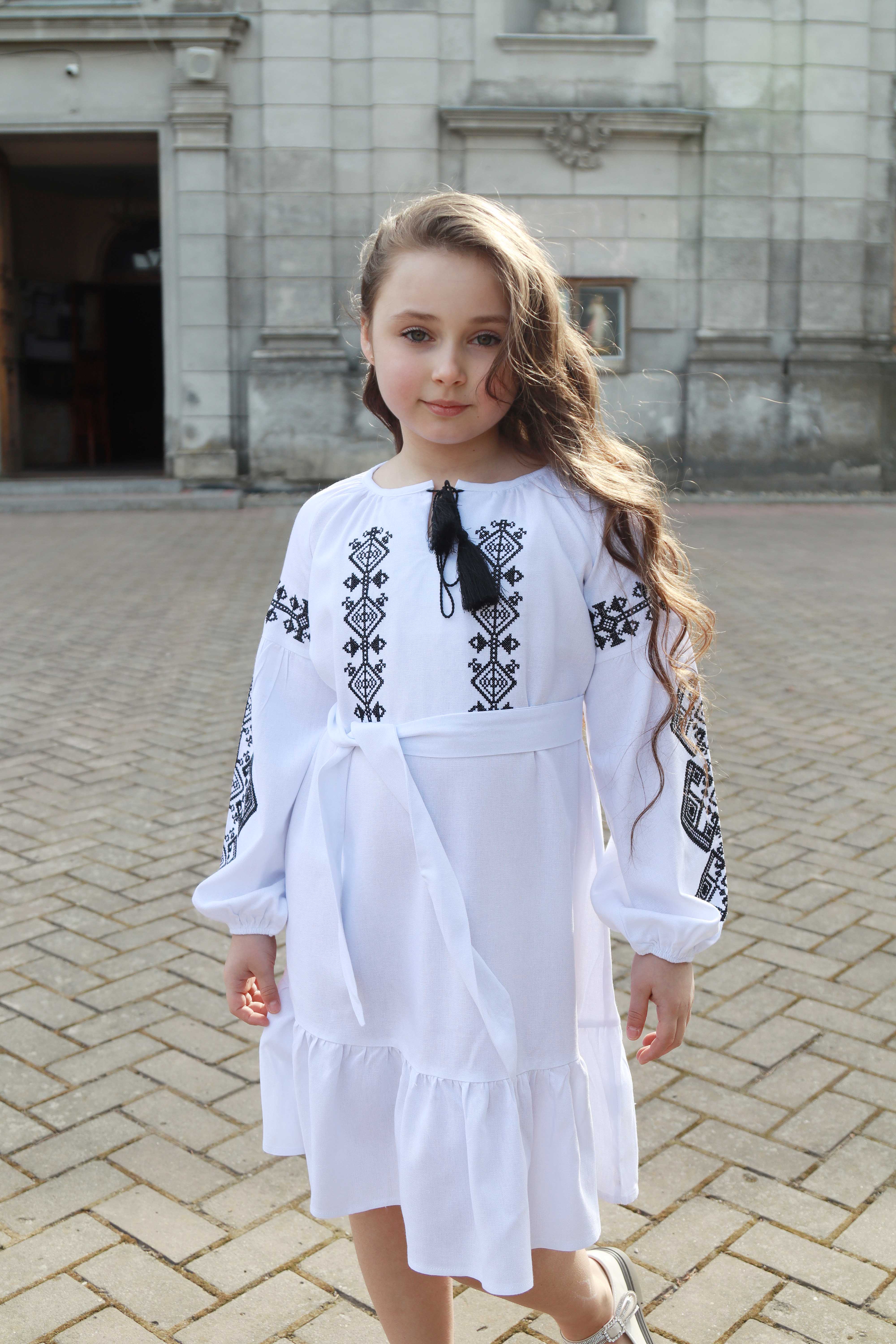 Сукня-вишиванка з льону. Модель вільного крою з поясом, що м’яко підкреслює талію. Горловина зав’язується китицями, а рукави оздоблені вишивкою з етномотивами. Легкий силует і продуманий дизайн створюють гармонійний образ для різних подій. Ця сукня поєднує традиційні символи української культури з комфортом сучасного одягу — з любов’ю до коріння і стилю.