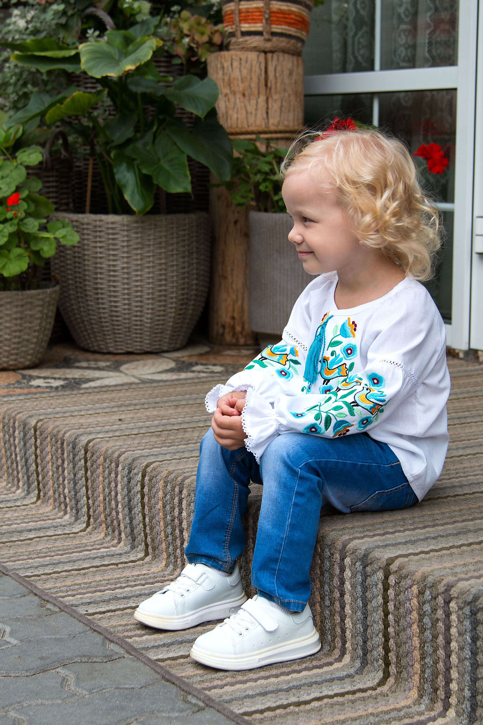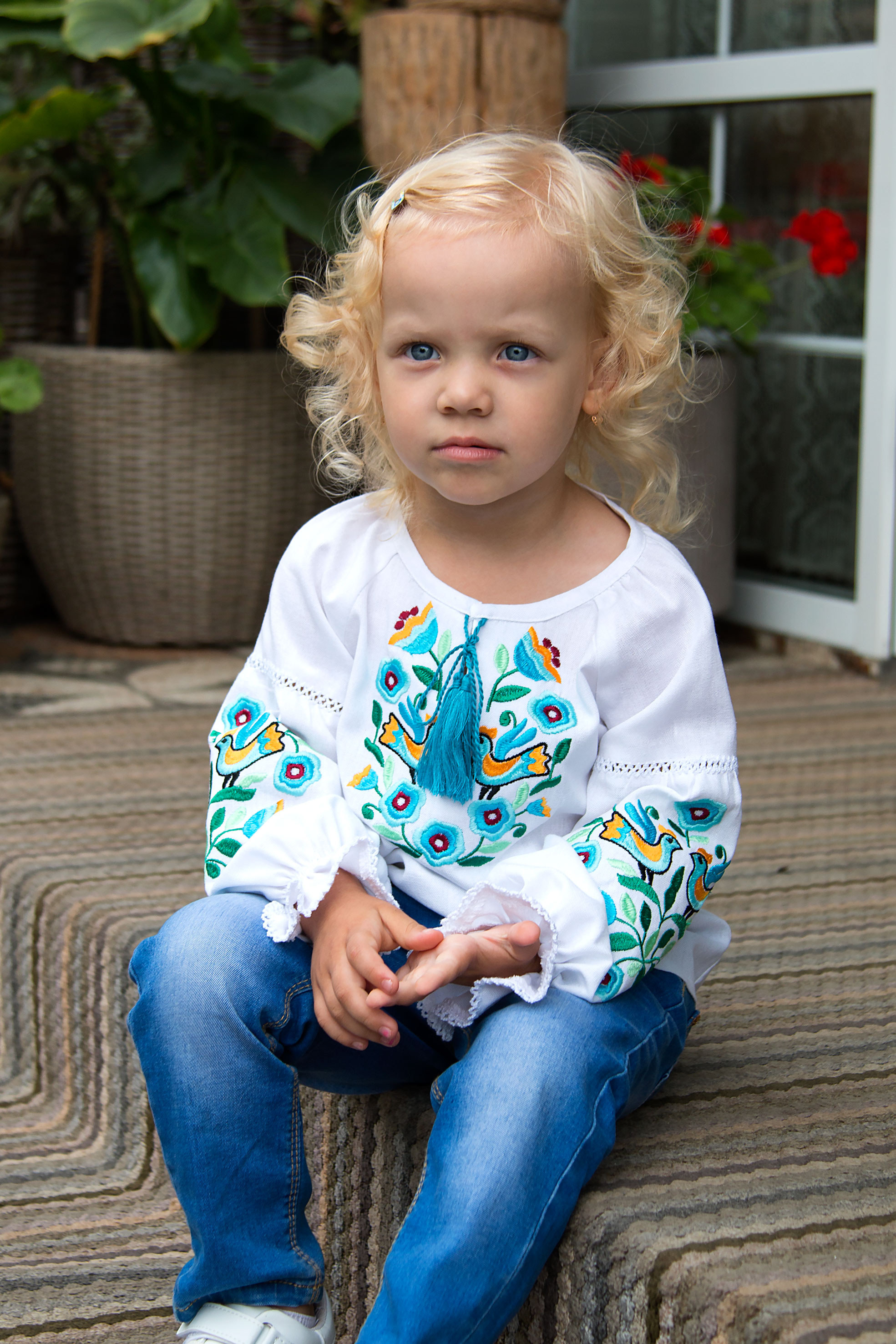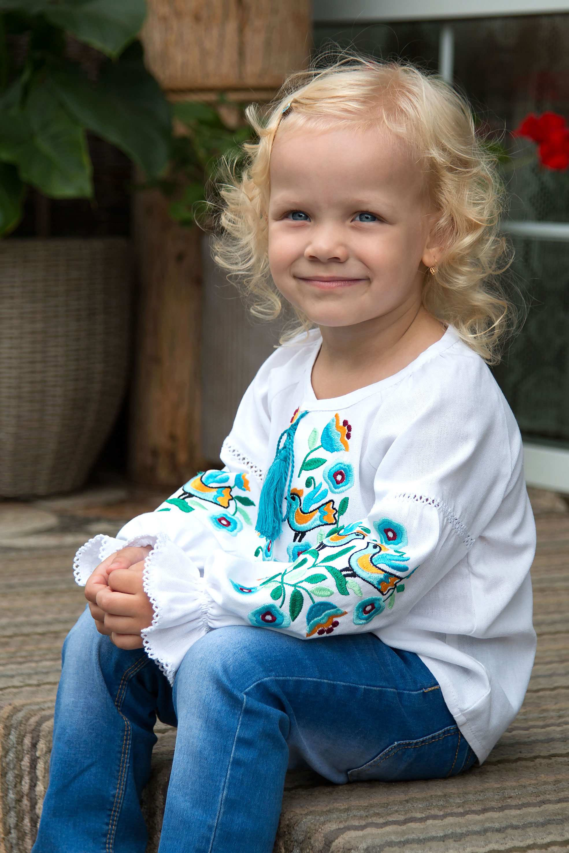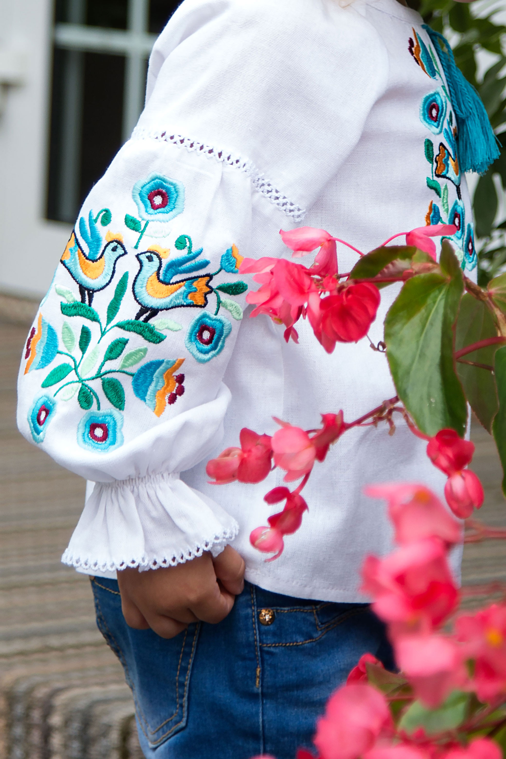 Вишиванка з льону, оздоблена яскравою вишивкою з мотивами птахів і квітів. Насичені відтінки вишивки надають виробу життєрадісного та святкового вигляду. Модель має зав’язки з китицями на горловині, а рукави й манжети прикрашені мережкою. Манжети з ніжною рюшею додають образу виразності та легкості. Стильне поєднання класики й сучасності — ідеальне для особливих подій.