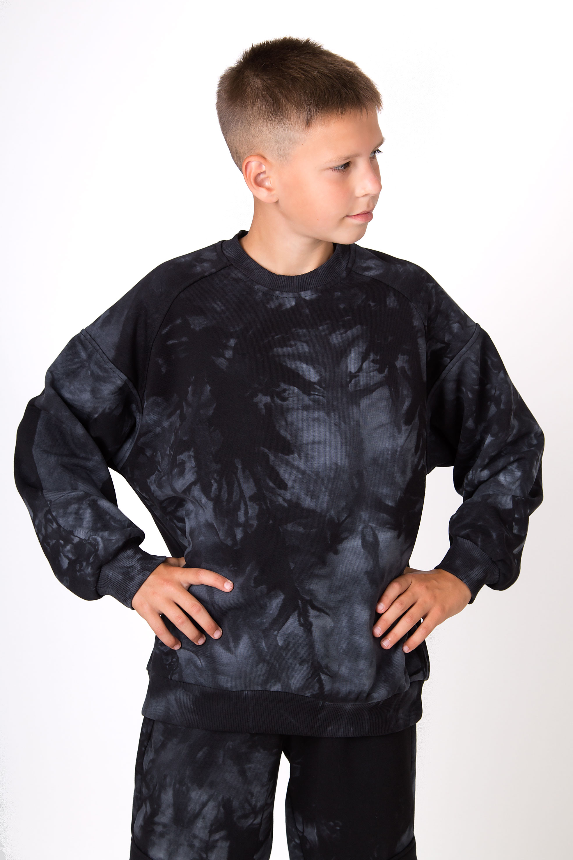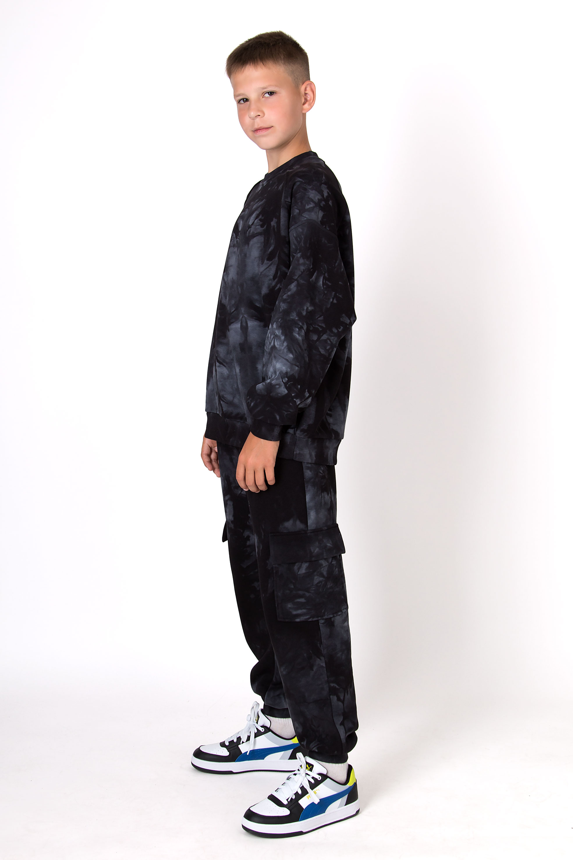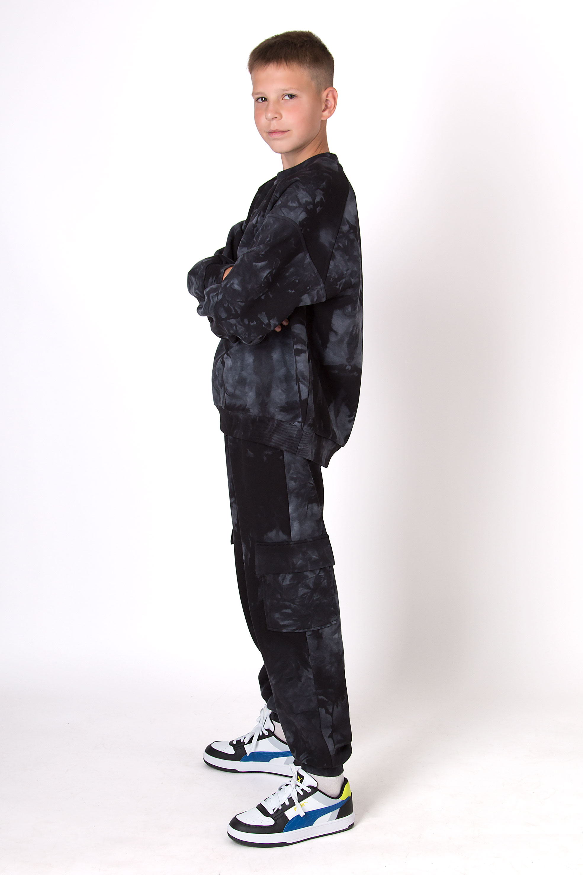 Костюм із тринитки петлі з ефектом тай-дай у відтінках сірого та чорного. М’який матеріал приємний до тіла, а сучасний дизайн додає образу стильного настрою. Ідеальний вибір для активних і модних дітей.