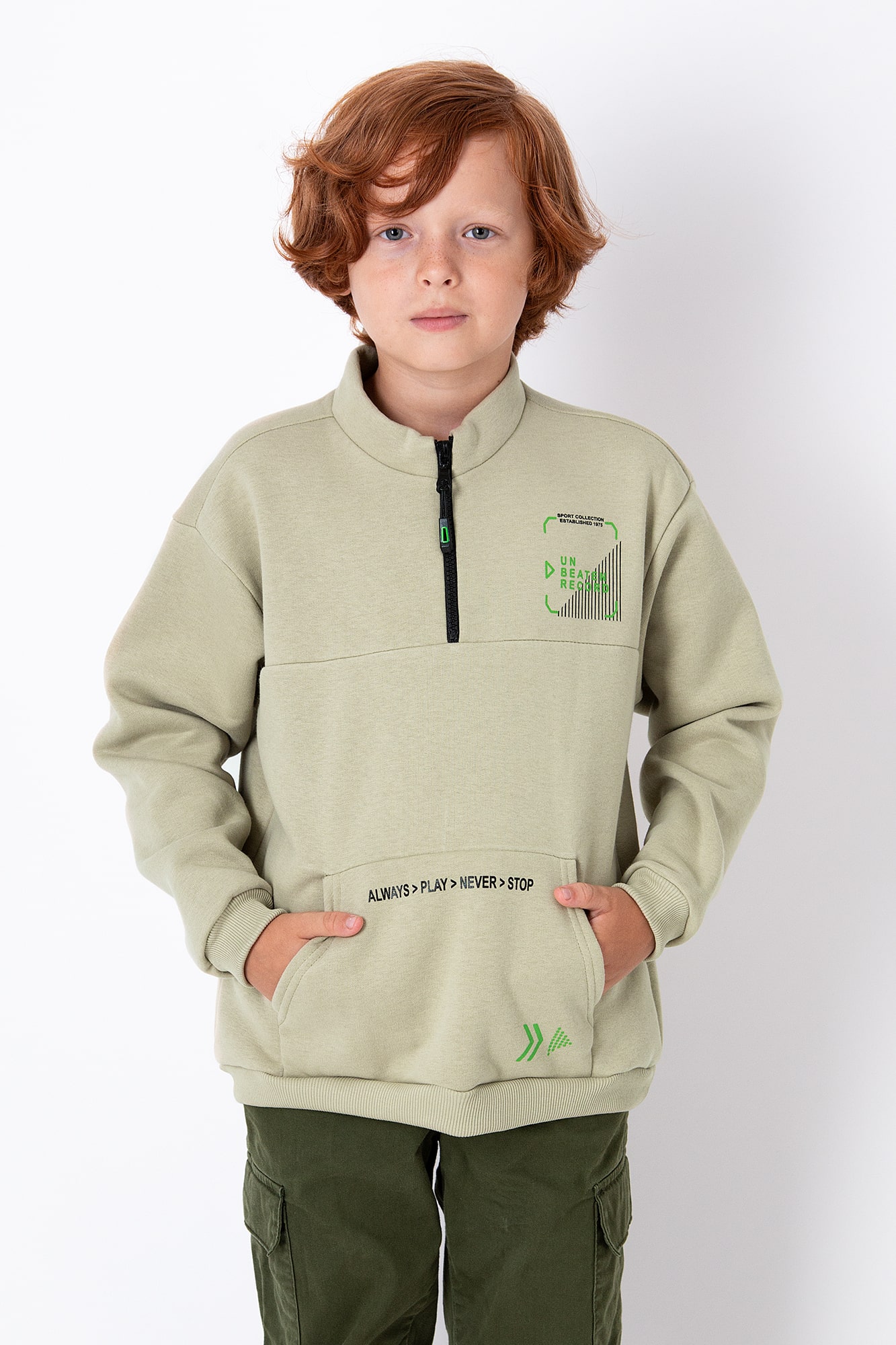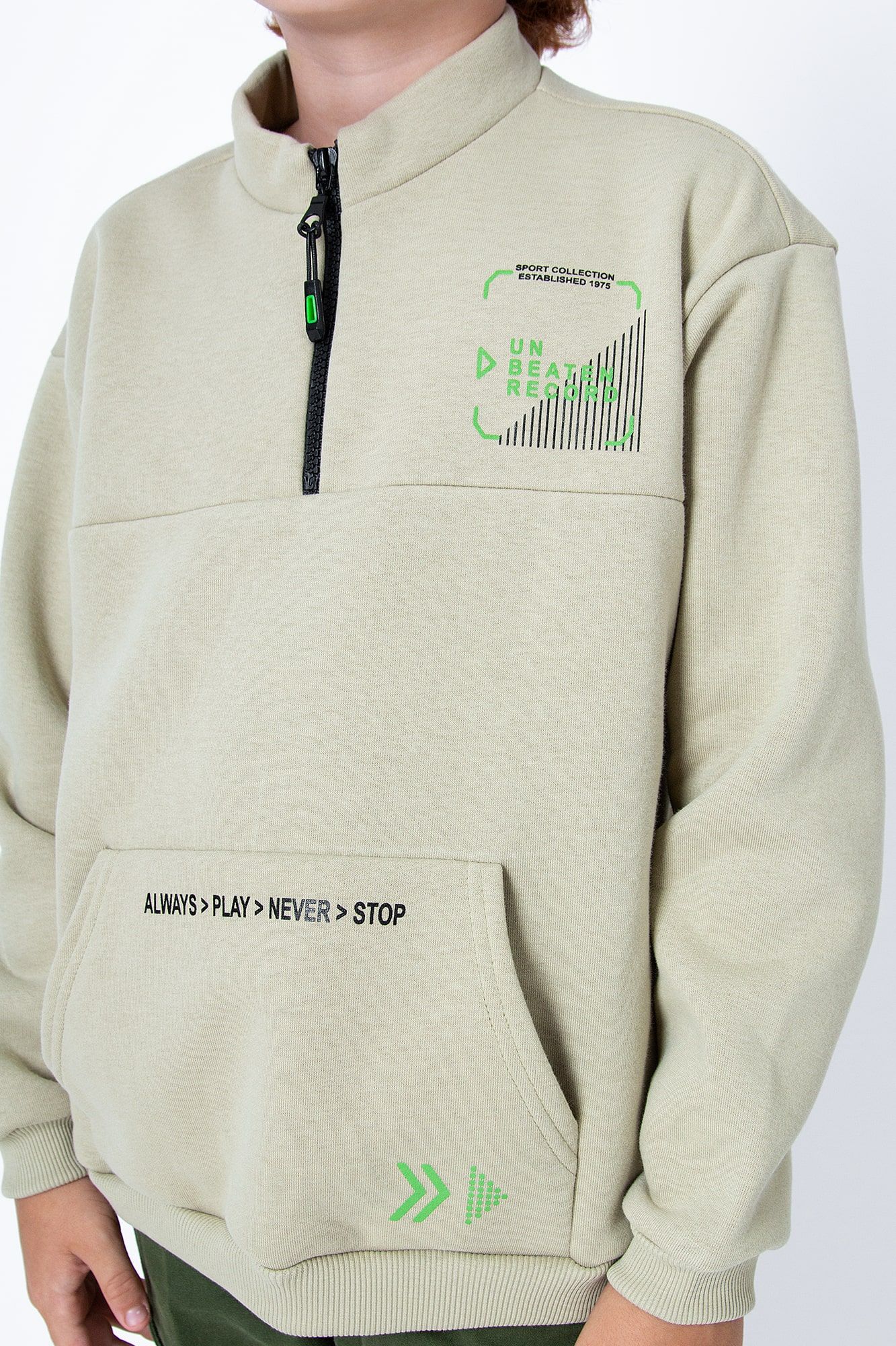 Світшот із тринитки на флісі . Модель з короткою блискавкою спереду, кишенею кенгуру та яскравими зеленими принтами. Зручний варіант на кожний день.