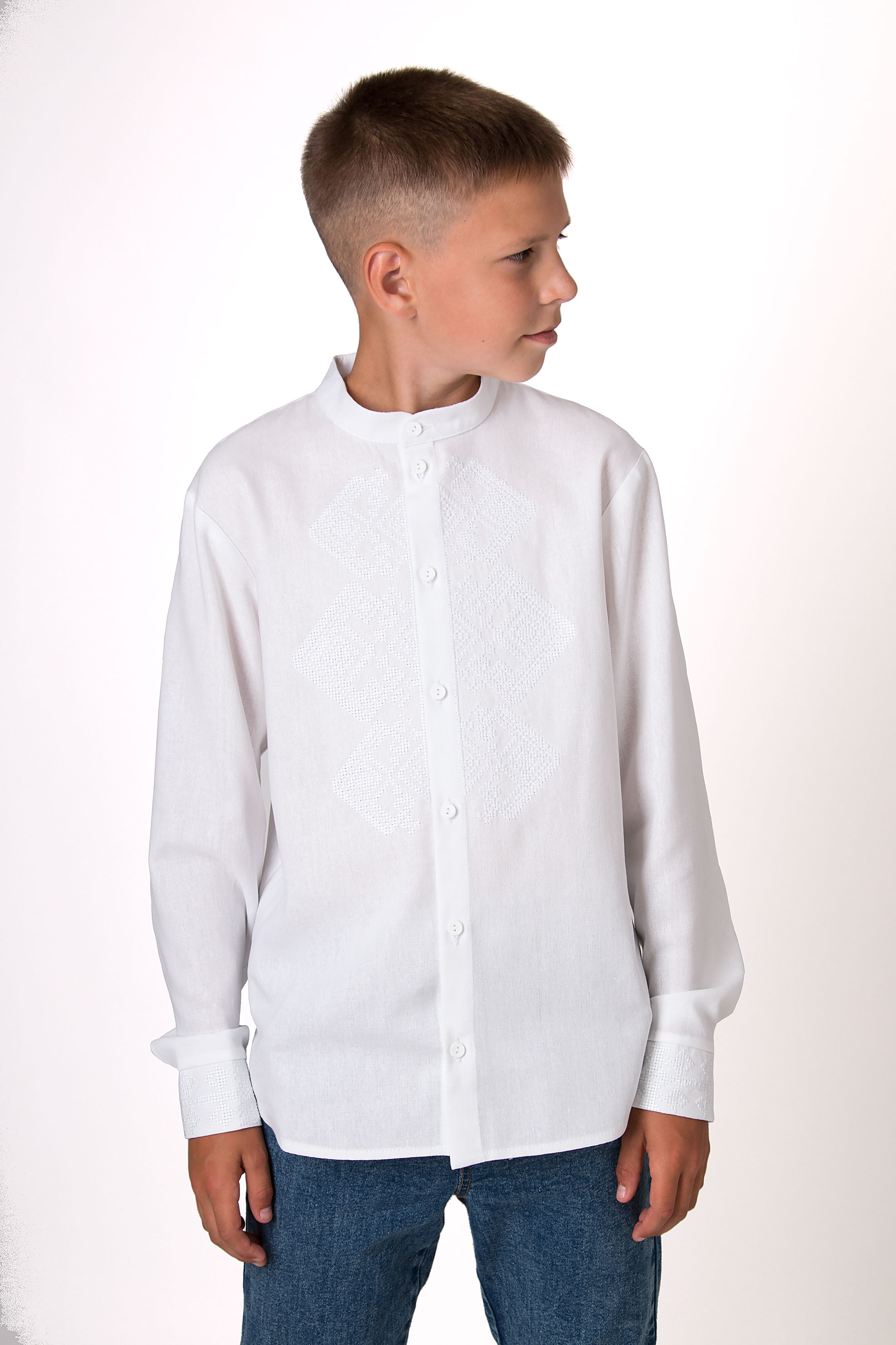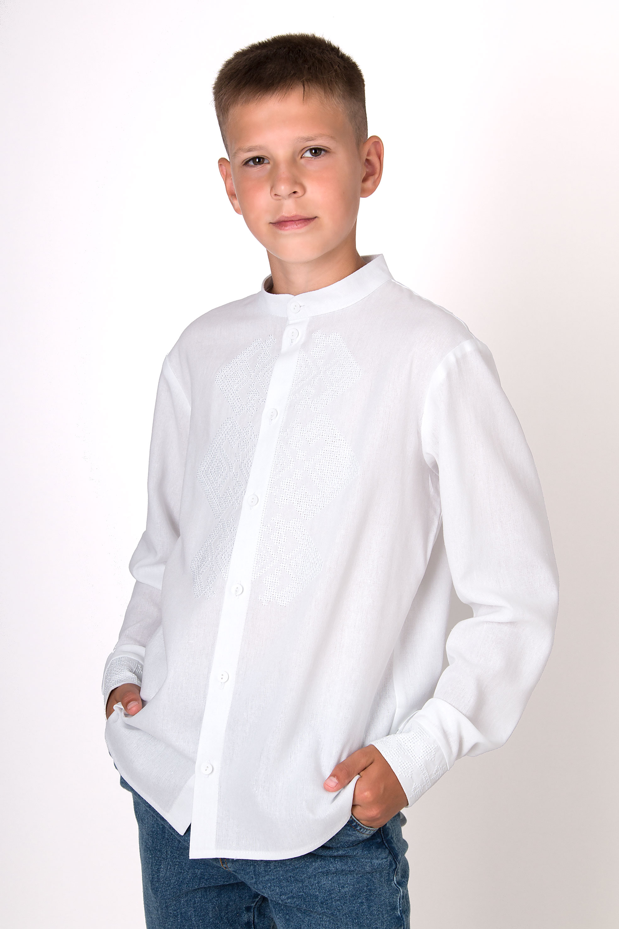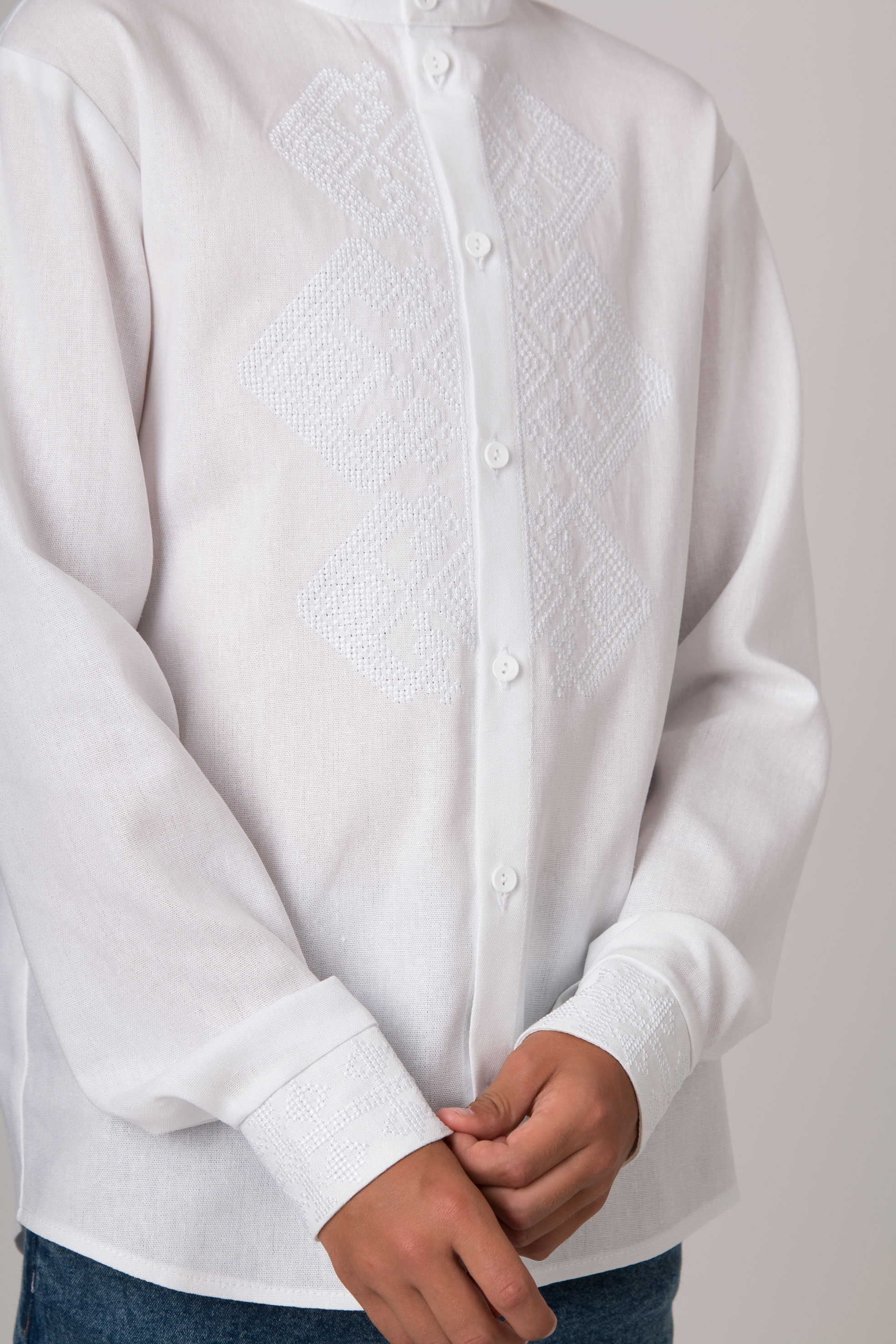 Сорочка з льону з вишитим геометричним орнаментом виконана білим по білому. Модель застібається на ґудзики спереду, має акуратні манжети та стриманий сучасний вигляд. Стильна класика для особливих подій і святкових образів.