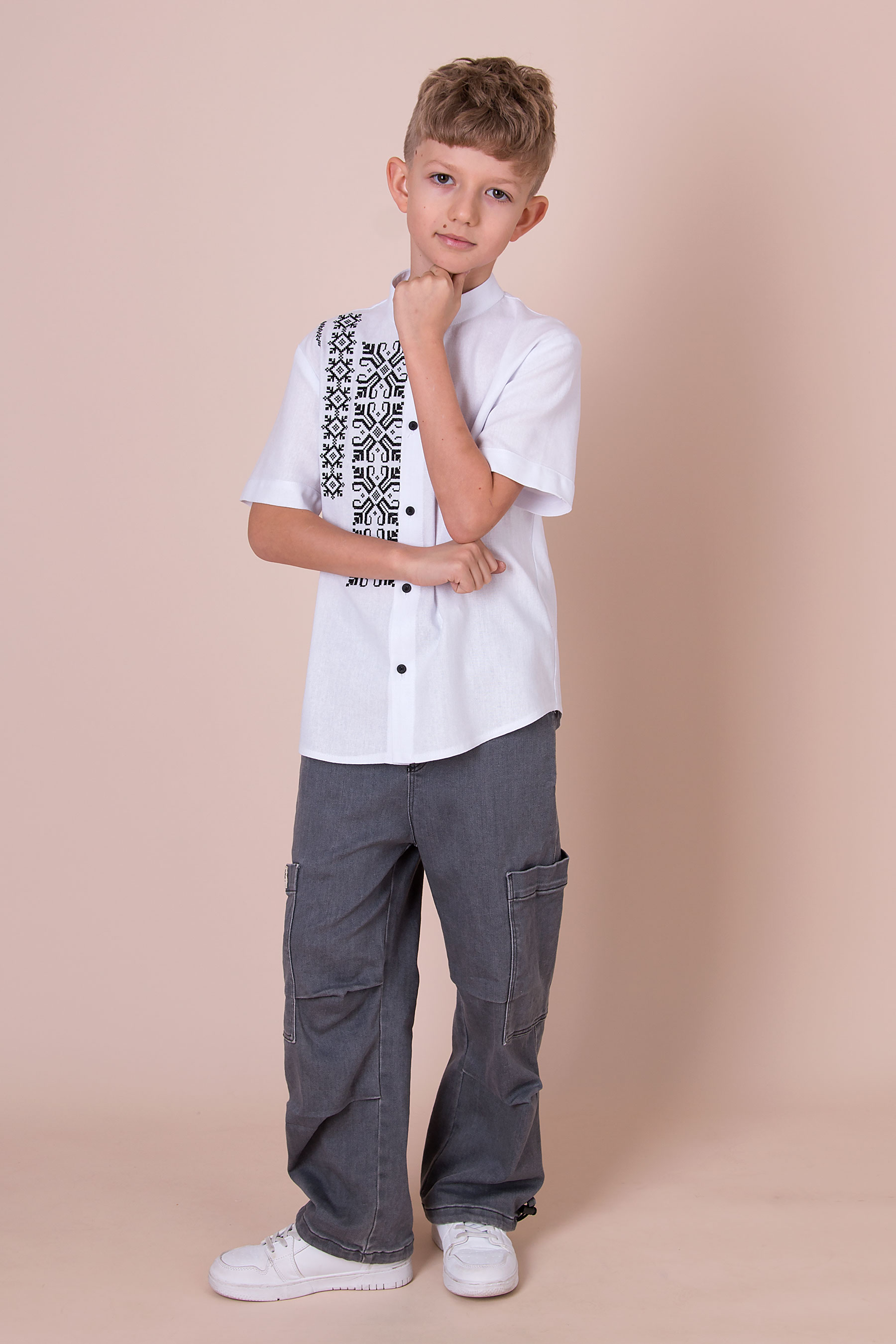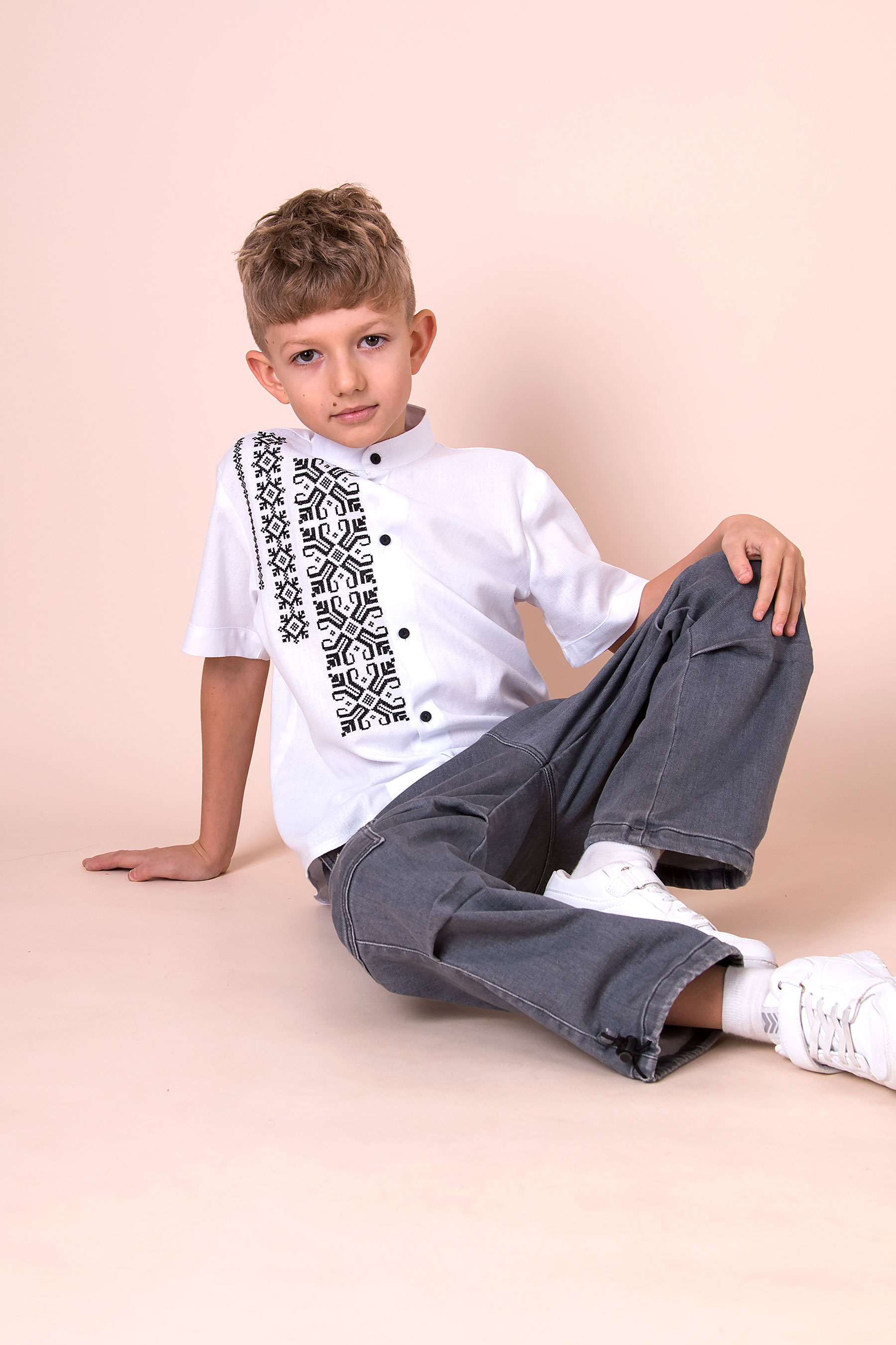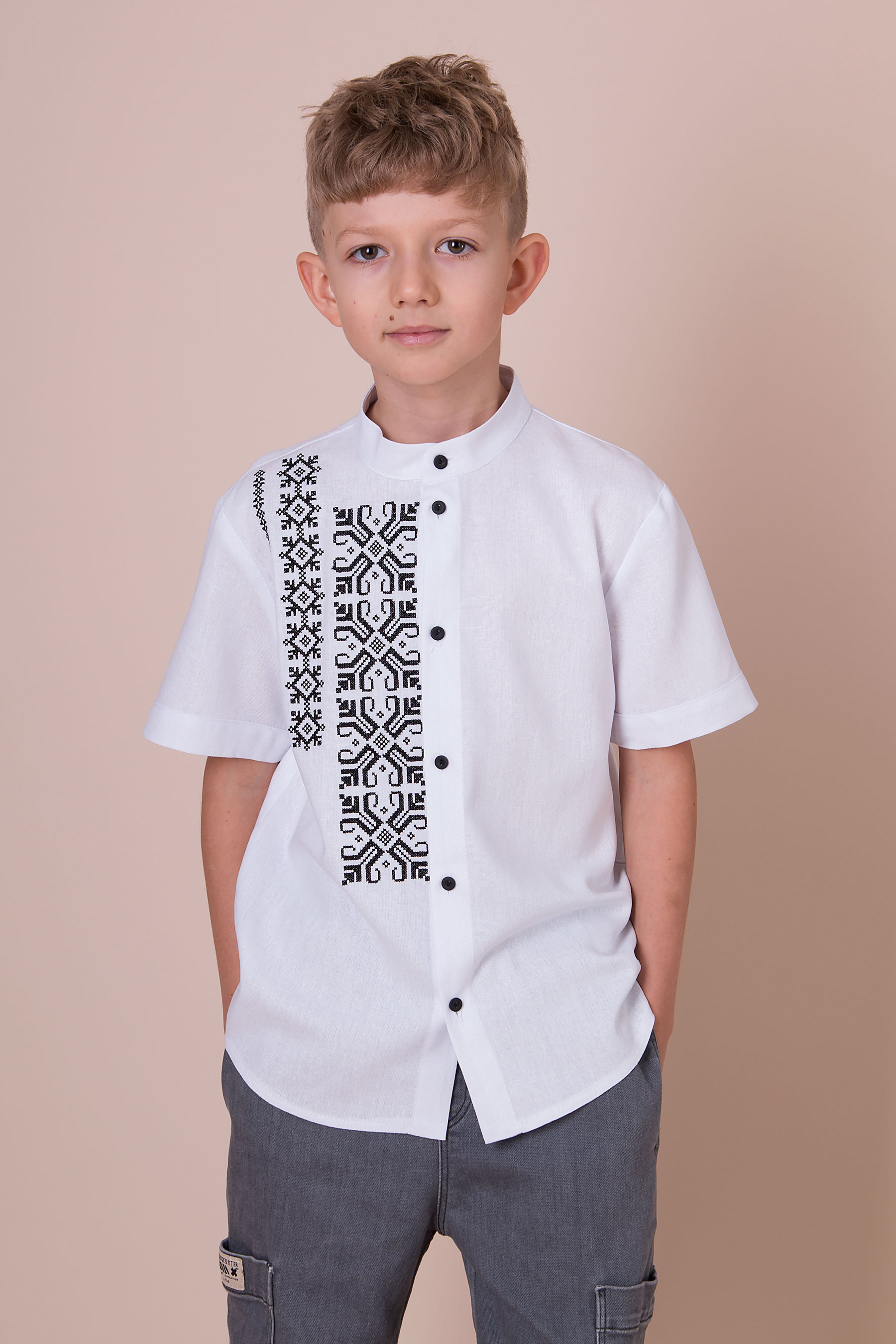 Модель із коротким рукавом і застібкою на гудзики вдало поєднує традиційні елементи з сучасним силуетом. Контрастна вишивка додає характеру, роблячи виріб доречним і для свят, і для щоденних образів.