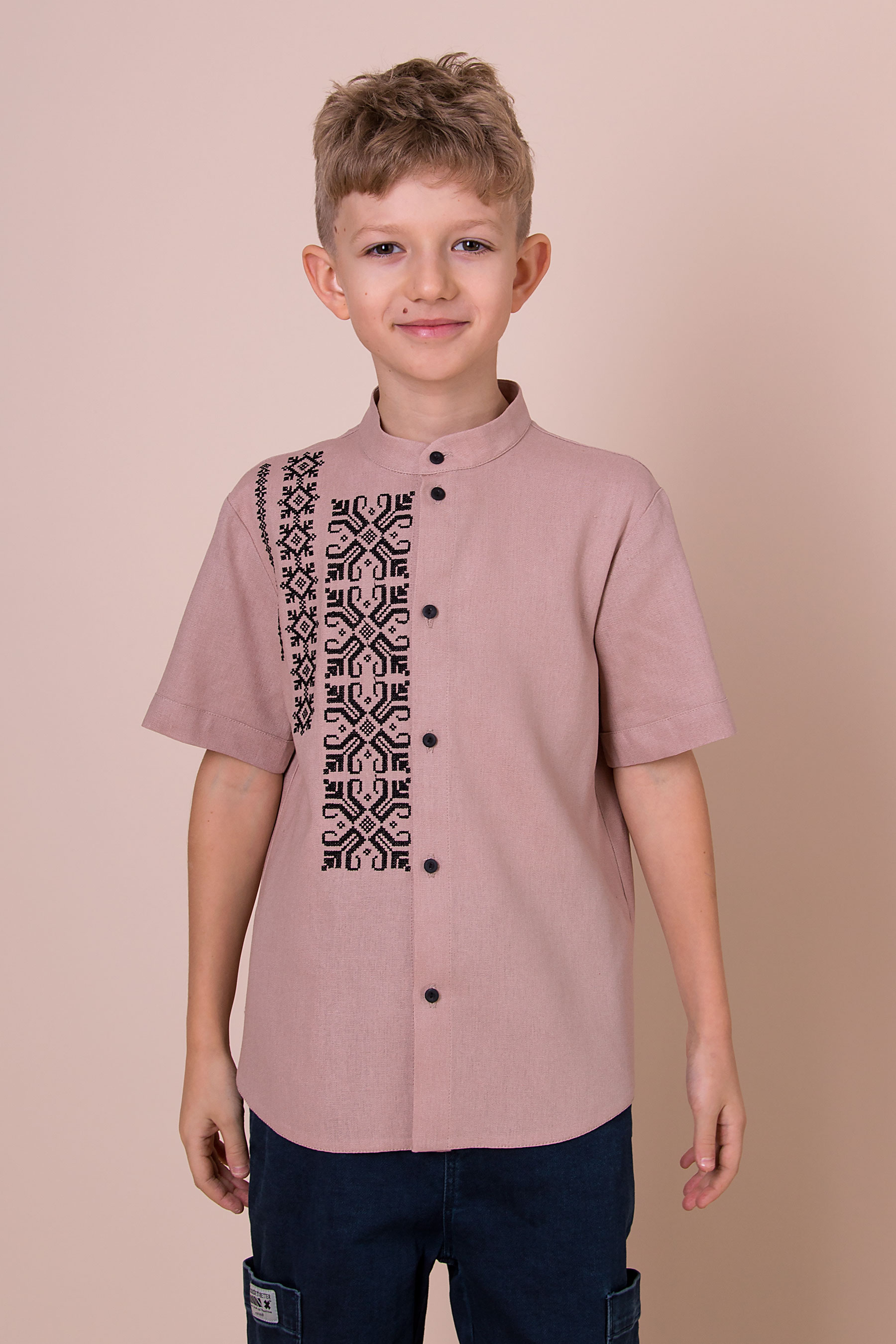 Модель із коротким рукавом і застібкою на гудзики вдало поєднує традиційні елементи з сучасним силуетом. Контрастна вишивка додає характеру, роблячи виріб доречним і для свят, і для щоденних образів.