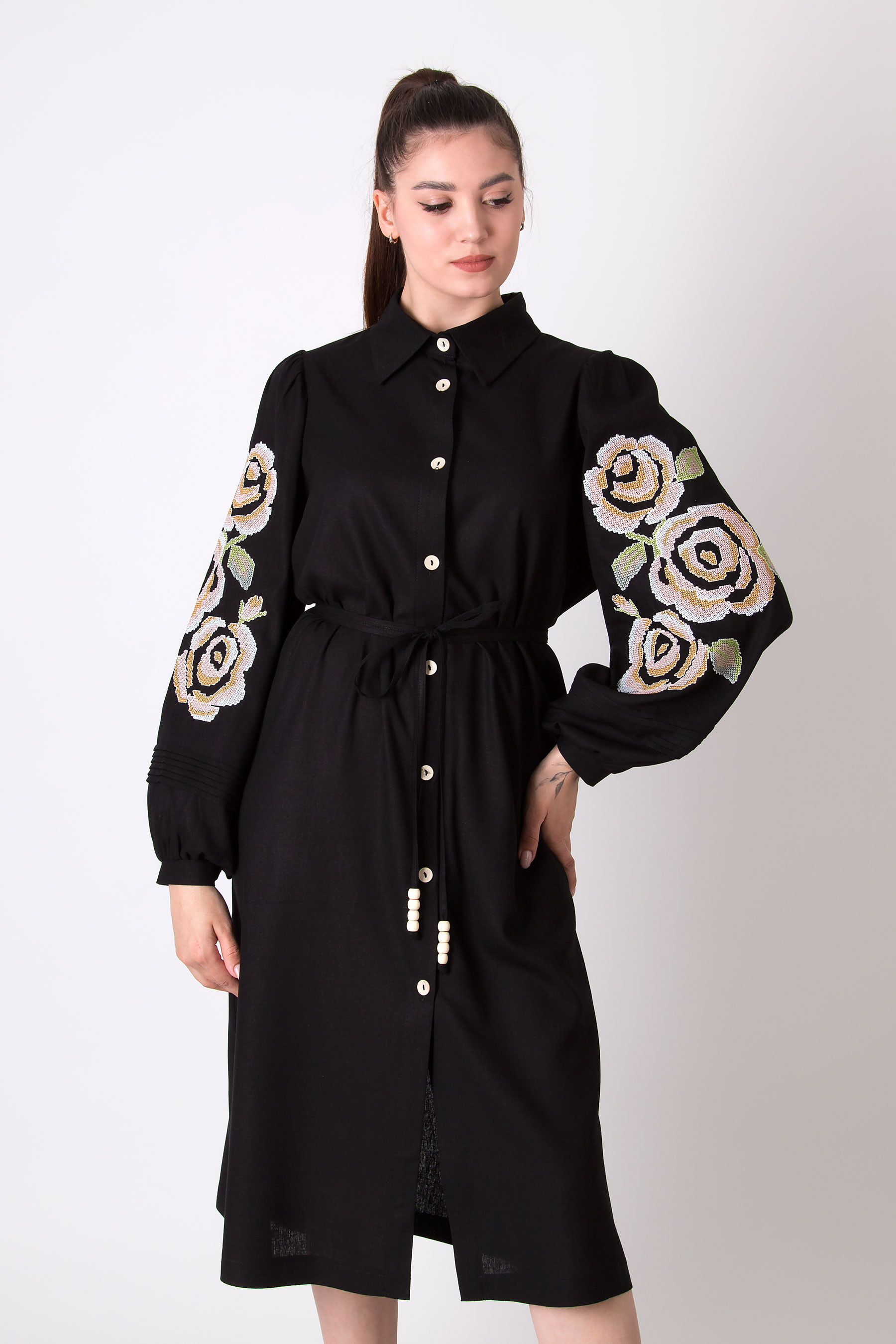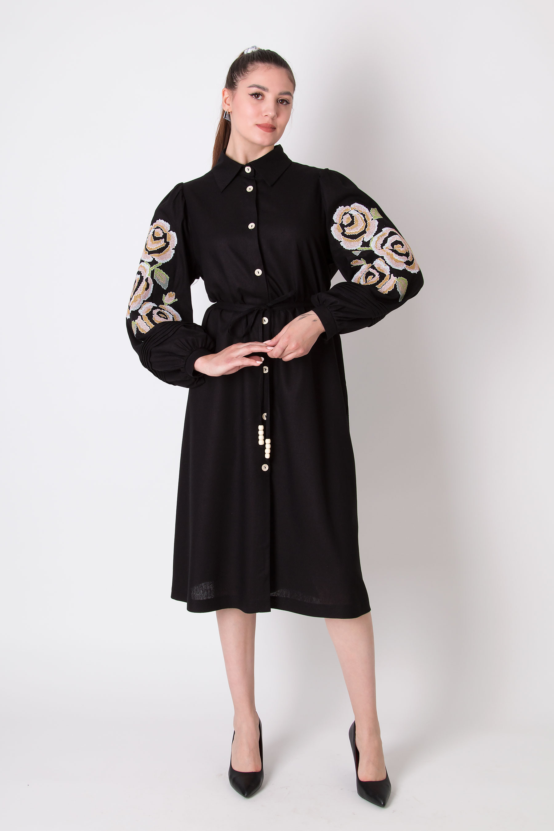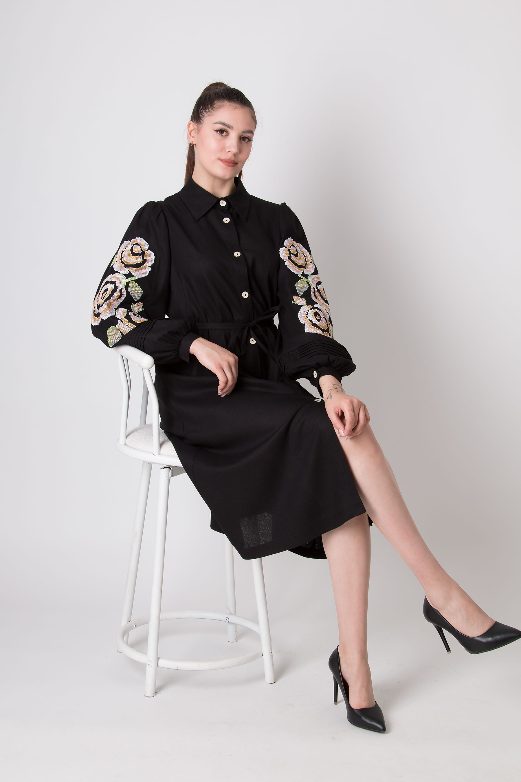 Вишита сукня з льону міді довжини з відкладним коміром і застібкою на ґудзики. Оздоблена об’ємними рукавами з вишивкою та доповнена поясом для акценту на талії. М’яка фактура льону й витончені деталі створюють сучасний і водночас вишуканий образ.
