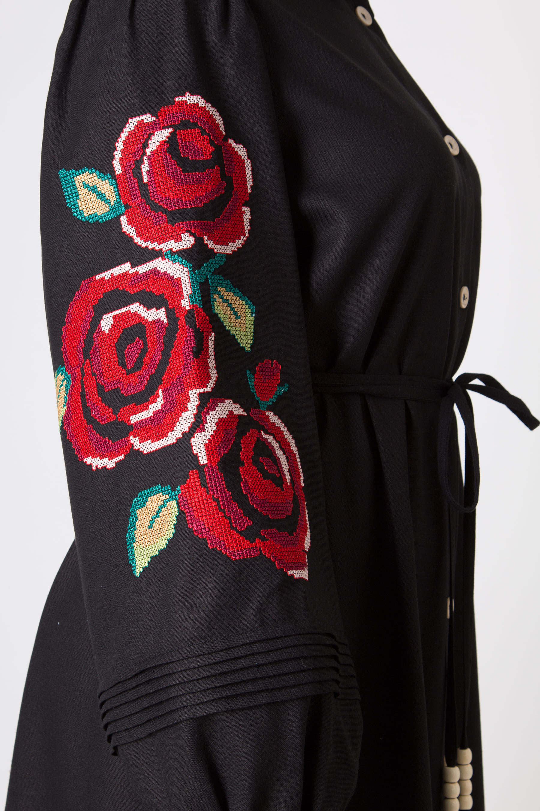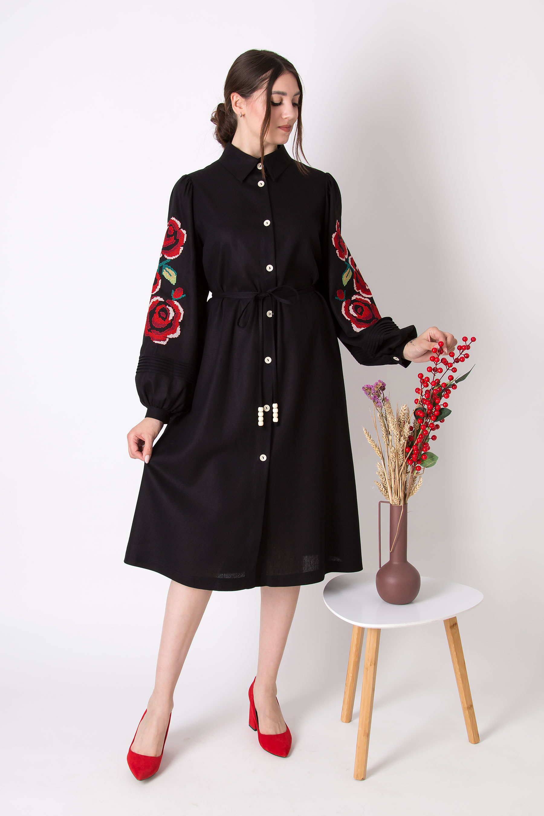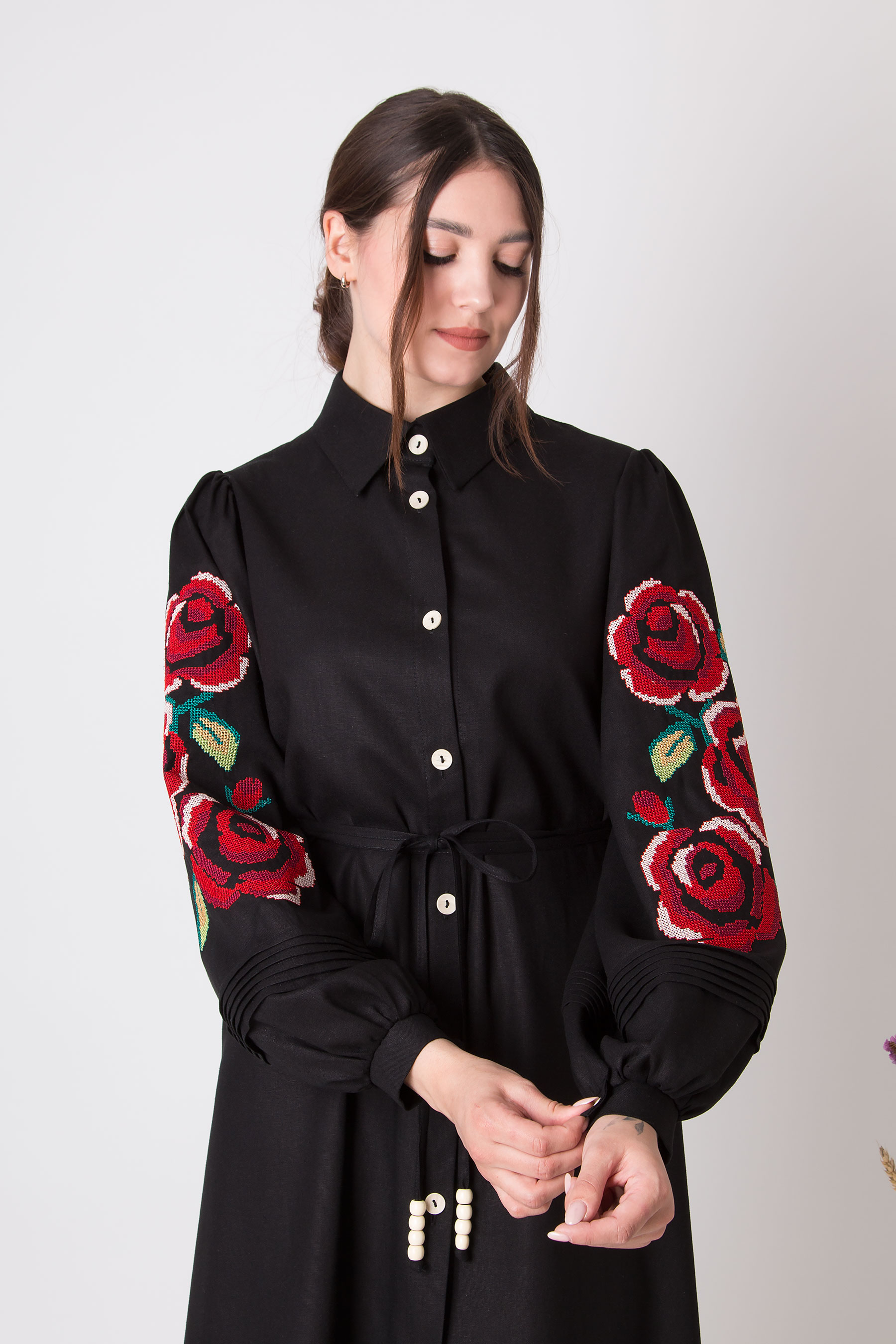 Вишита сукня з льону міді довжини з відкладним коміром і застібкою на ґудзики. Оздоблена об’ємними рукавами з вишивкою та доповнена поясом для акценту на талії. М’яка фактура льону й витончені деталі створюють сучасний і водночас вишуканий образ.