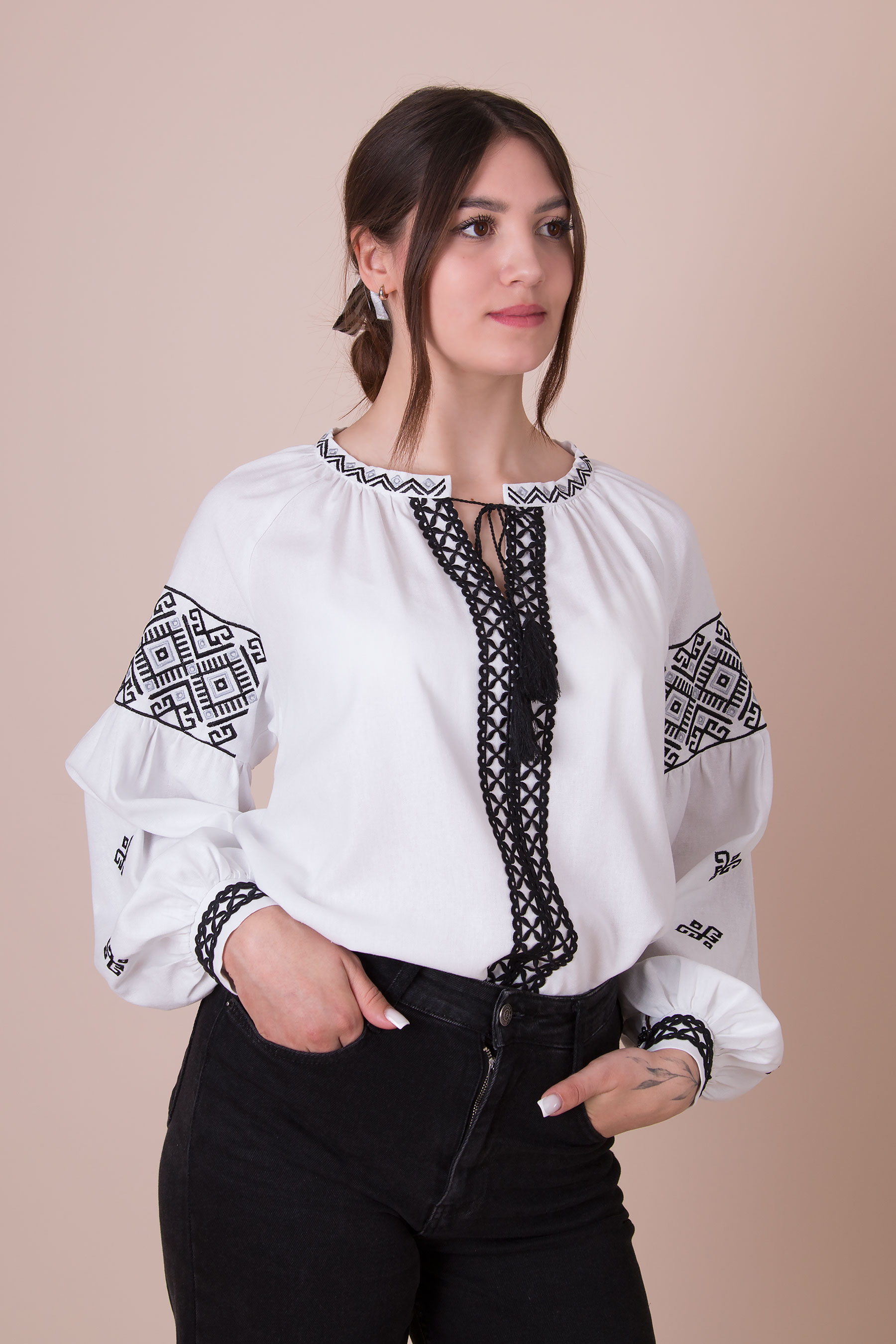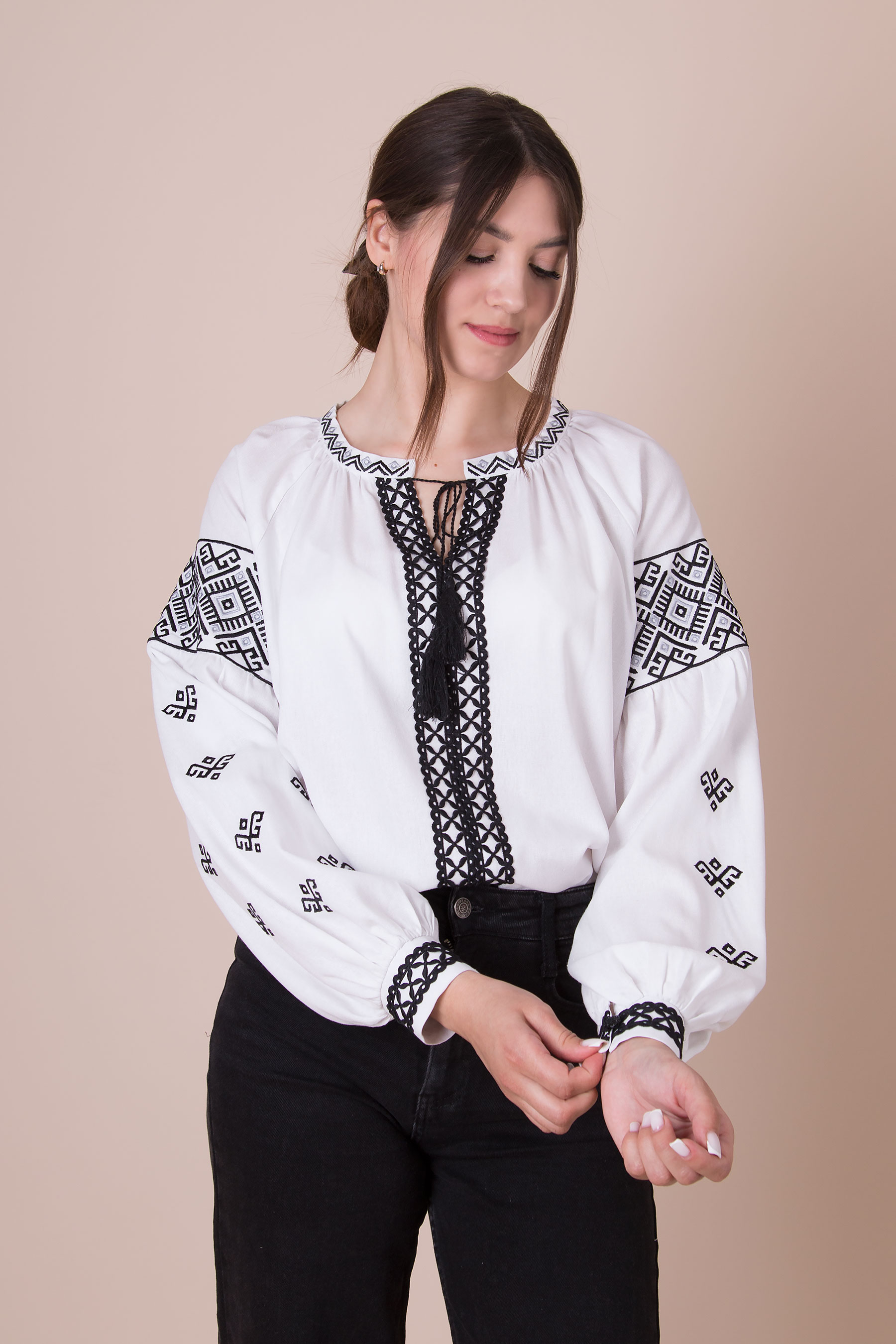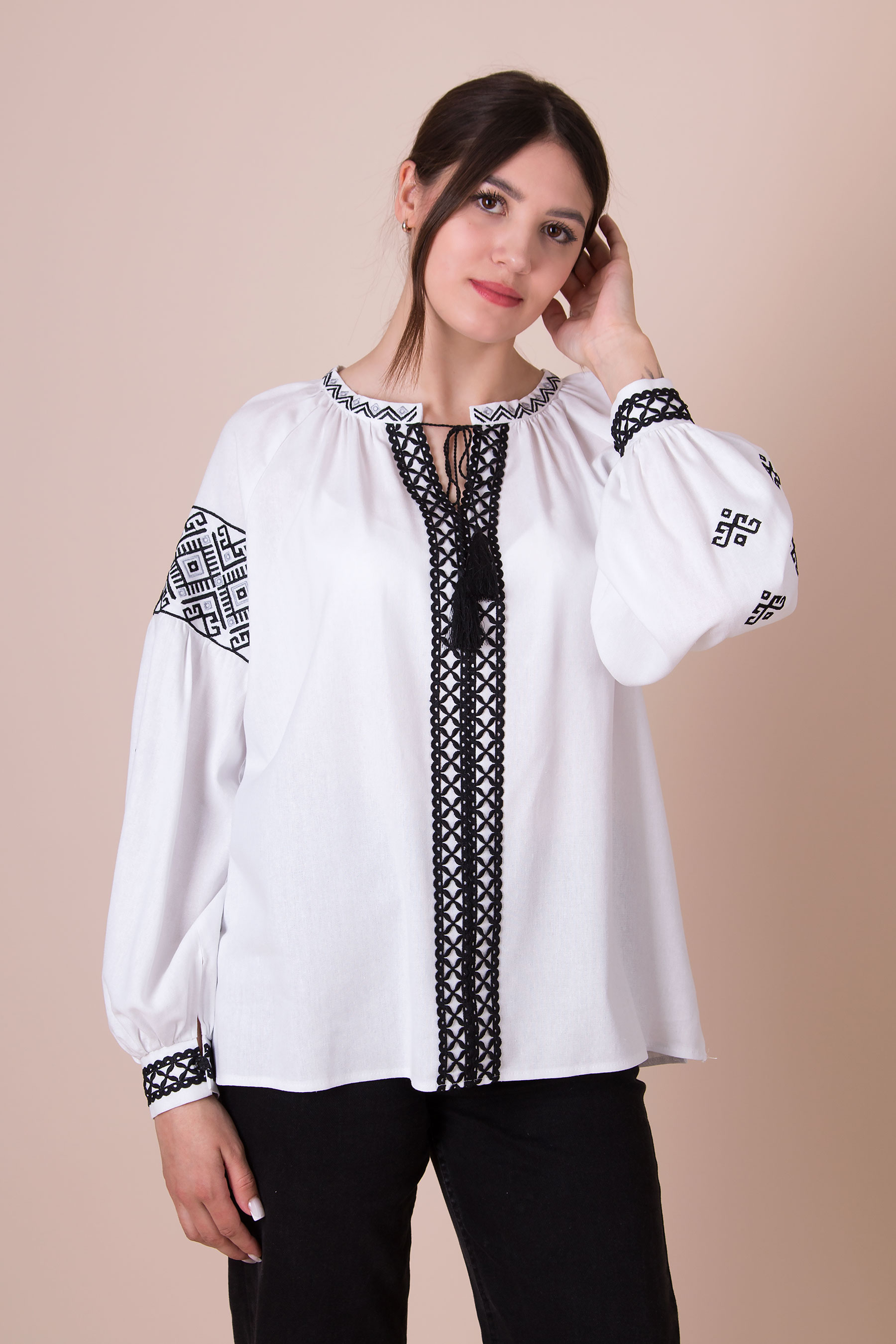 Лляна жіноча вишиванка з контрастною вишивкою. Тканина легка, приємна до тіла і підходить на будь-який сезон. Модель має об’ємні рукави з манжетами та зав’язка на китиці. Вишивка додає виробу національного характеру, але виглядає стримано і елегантно. Модель легко комбінується з брюками чи спідницями, підходить для роботи, свят та щоденних образів. Універсальна та стильна річ, яка поєднує традиції і сучасність.