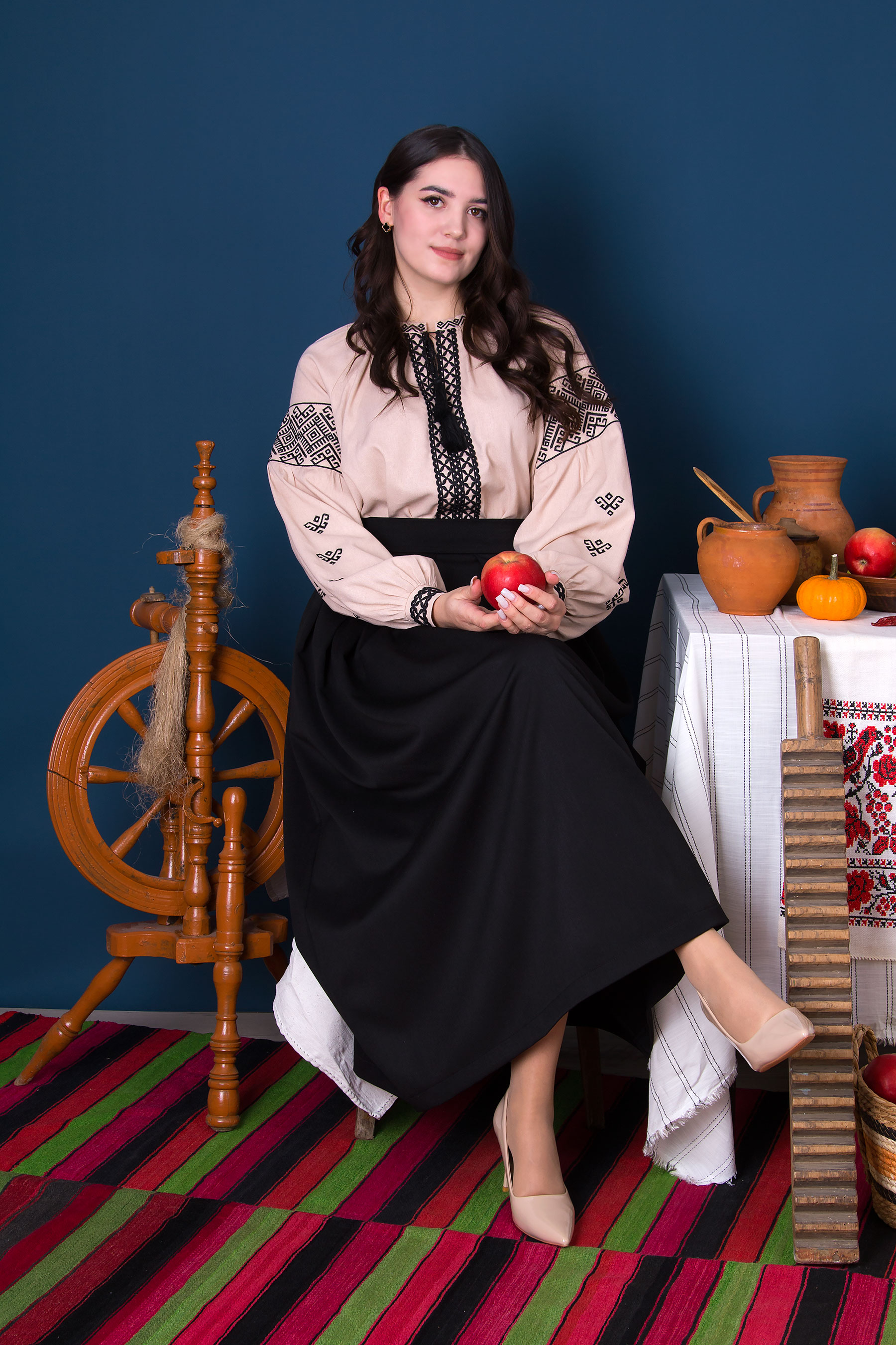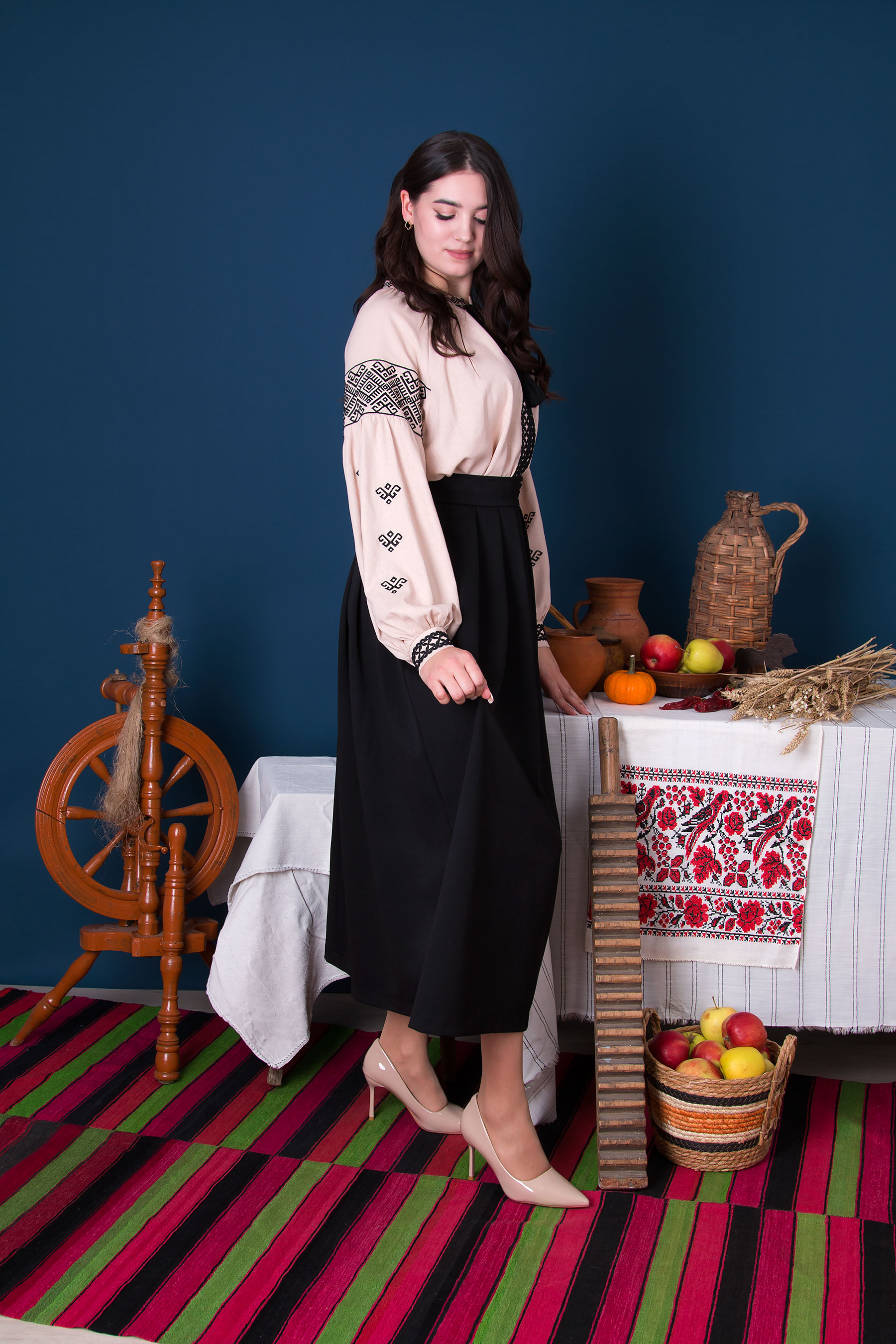 Лляна жіноча вишиванка з контрастною вишивкою. Тканина легка, приємна до тіла і підходить на будь-який сезон. Модель має об’ємні рукави з манжетами та зав’язка на китиці. Вишивка додає виробу національного характеру, але виглядає стримано і елегантно. Модель легко комбінується з брюками чи спідницями, підходить для роботи, свят та щоденних образів. Універсальна та стильна річ, яка поєднує традиції і сучасність.