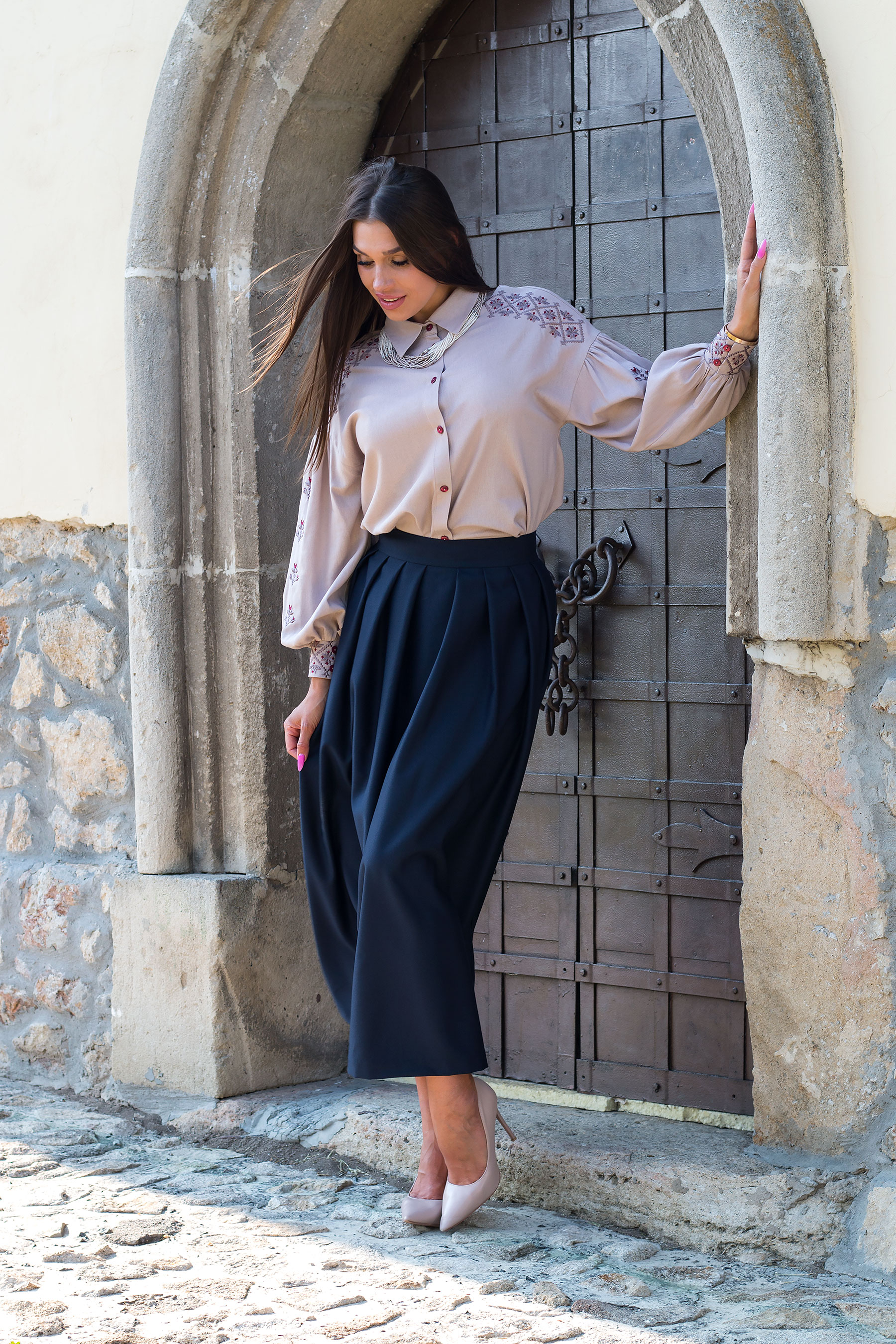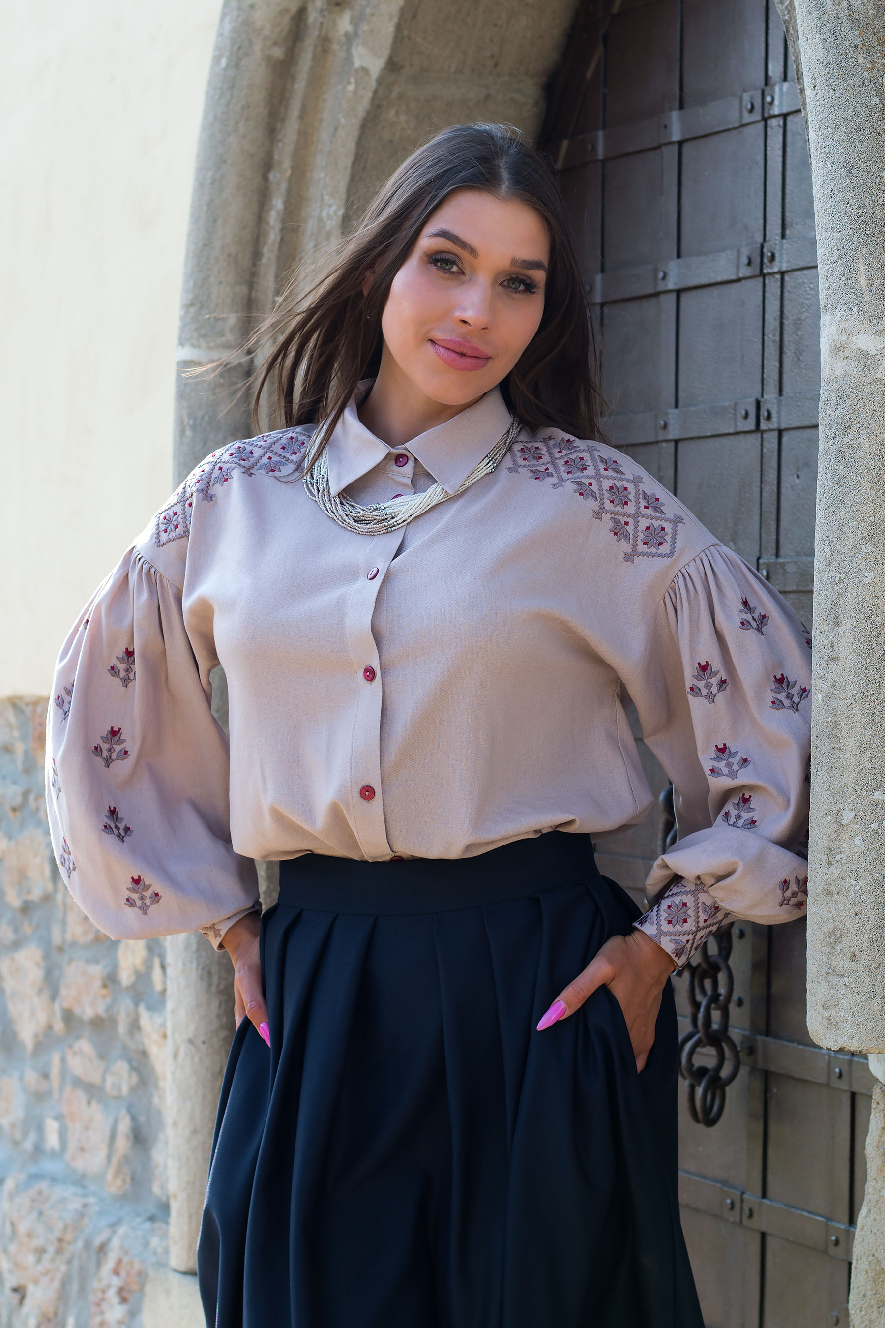 Вишиванка з льону поєднує традиційні елементи та сучасний вигляд. Об’ємні рукави з широкими манжетами додають виробу елегантності. Акуратна вишивка на плечах і рукавах підтримує традиційний настрій у сучасному виконанні. Ідеальний варіант для святкових подій — стримана, красива й виразна.