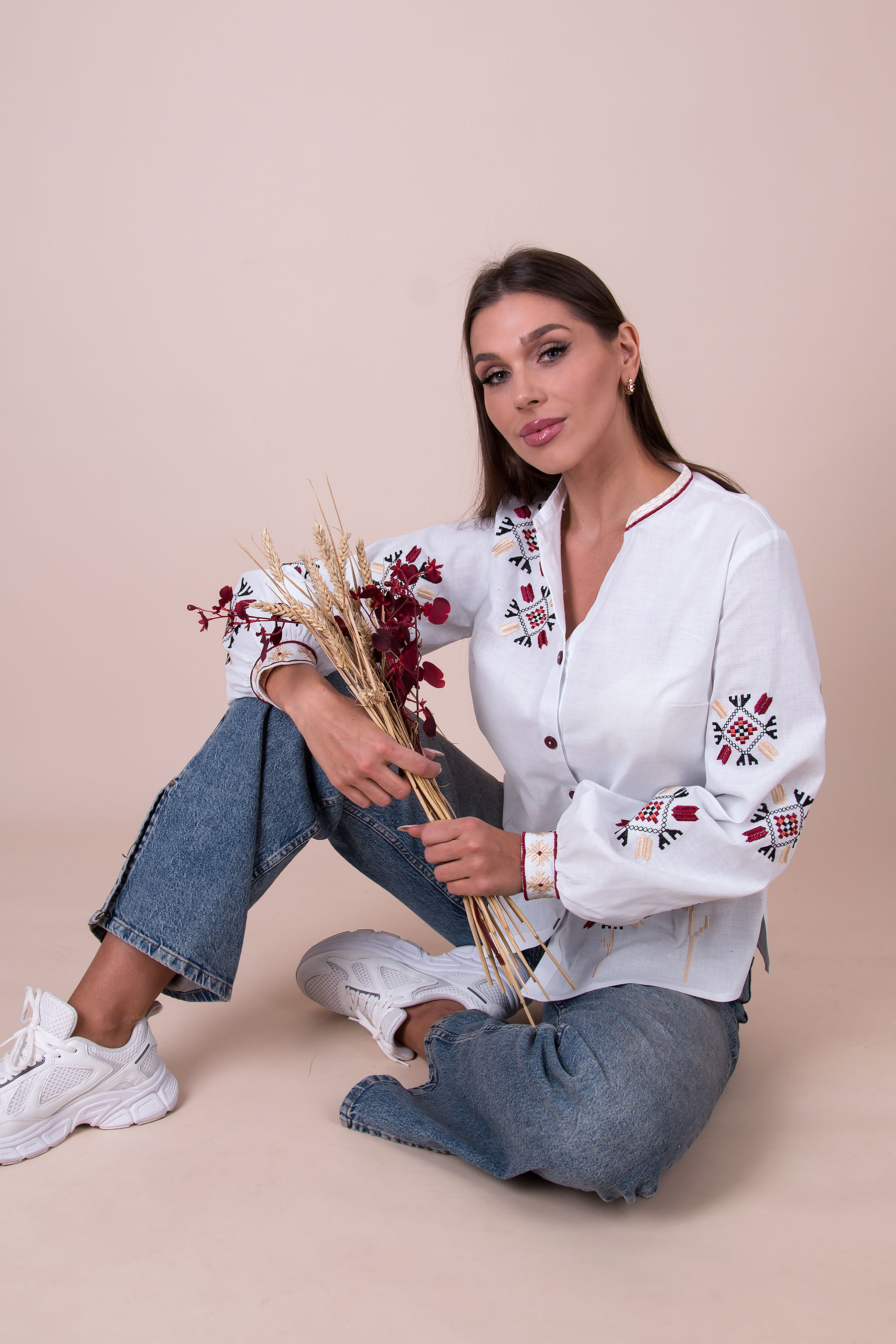 Жіноча вишиванка з традиційними українськими орнаментами. Модель прямого силуету з V-подібним вирізом, застібається на ґудзики. Довгі рукави зібрані на манжети та оздоблені вишивкою. Орнамент розміщений на грудях і рукавах. Льон стрейч легкий, дихаючий, приємний до тіла.