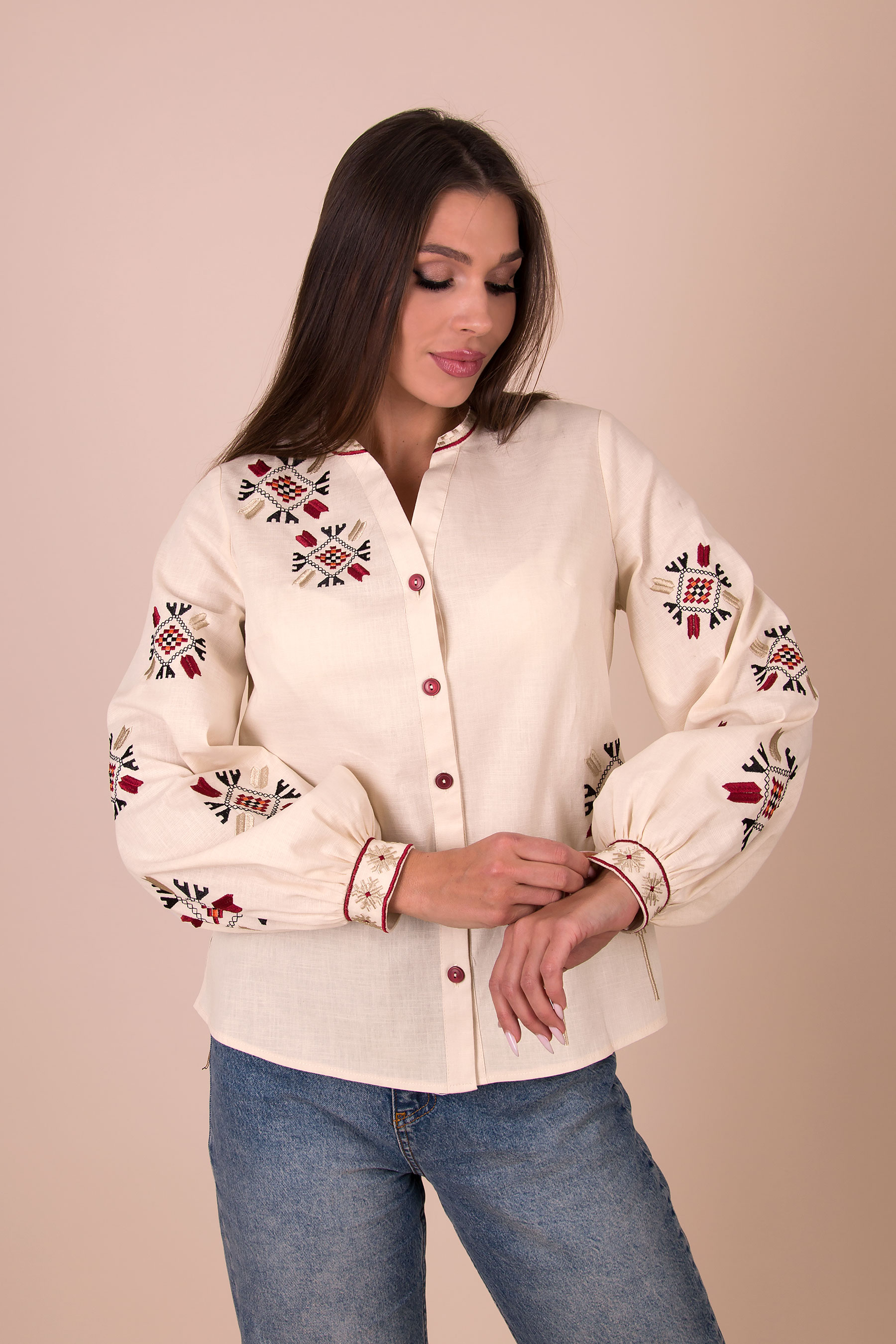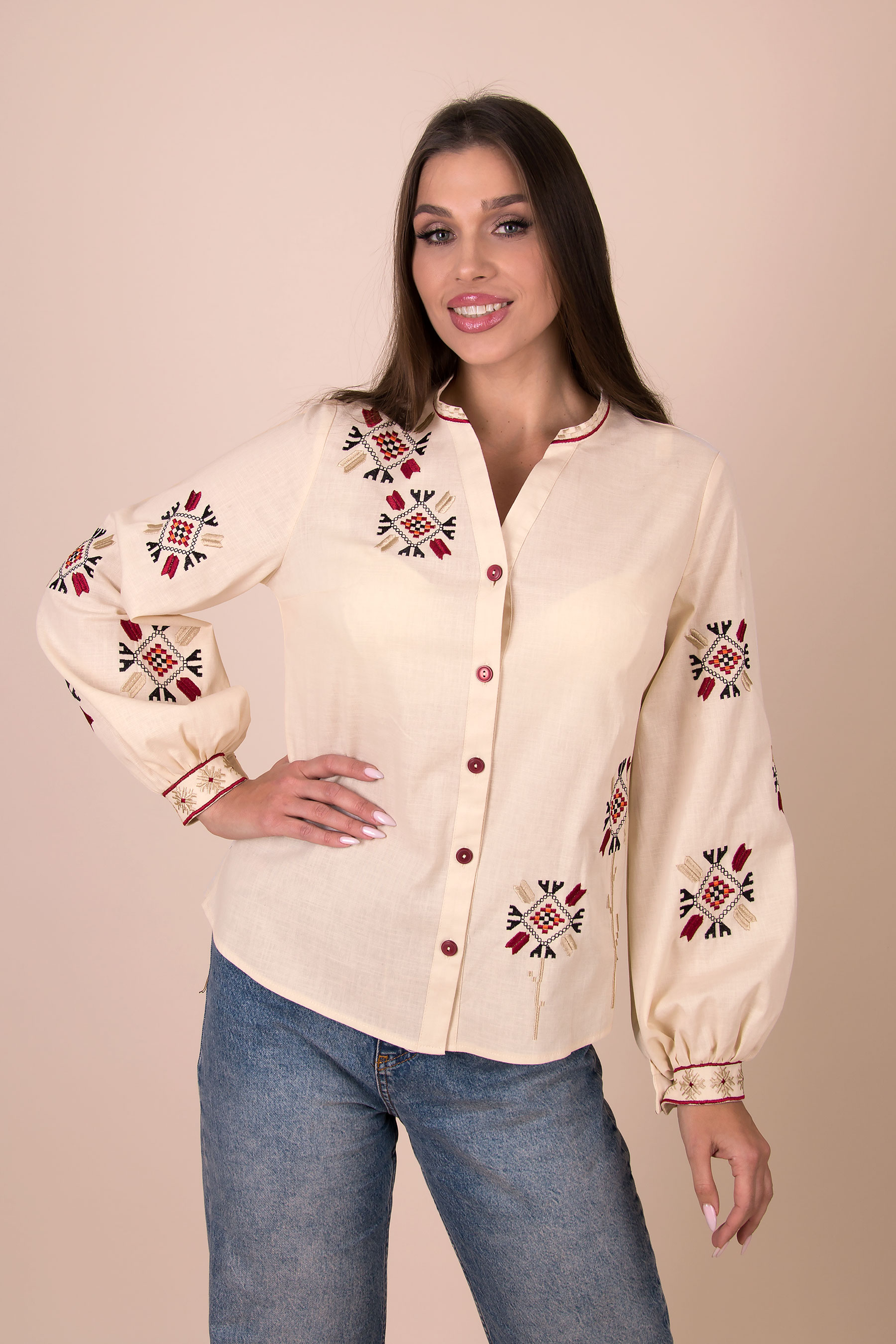 Жіноча вишиванка з традиційними українськими орнаментами. Модель прямого силуету з V-подібним вирізом, застібається на ґудзики. Довгі рукави зібрані на манжети та оздоблені вишивкою. Орнамент розміщений на грудях і рукавах. Льон стрейч легкий, дихаючий, приємний до тіла.