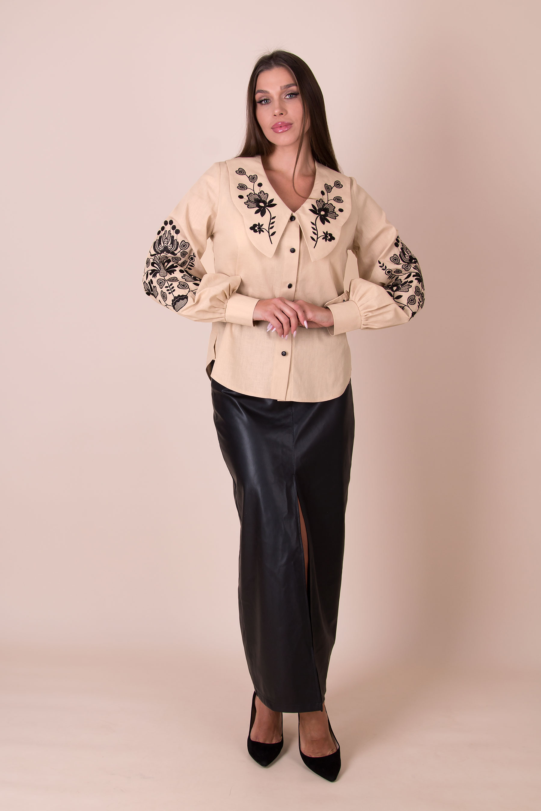Жіноча вишиванка з квітковими орнаментами у традиційній українській стилістиці. Модель має вишитий комірець, широкі рукави та застібку на гудзики. Орнамент формує виразний акцент і підкреслює український характер виробу.